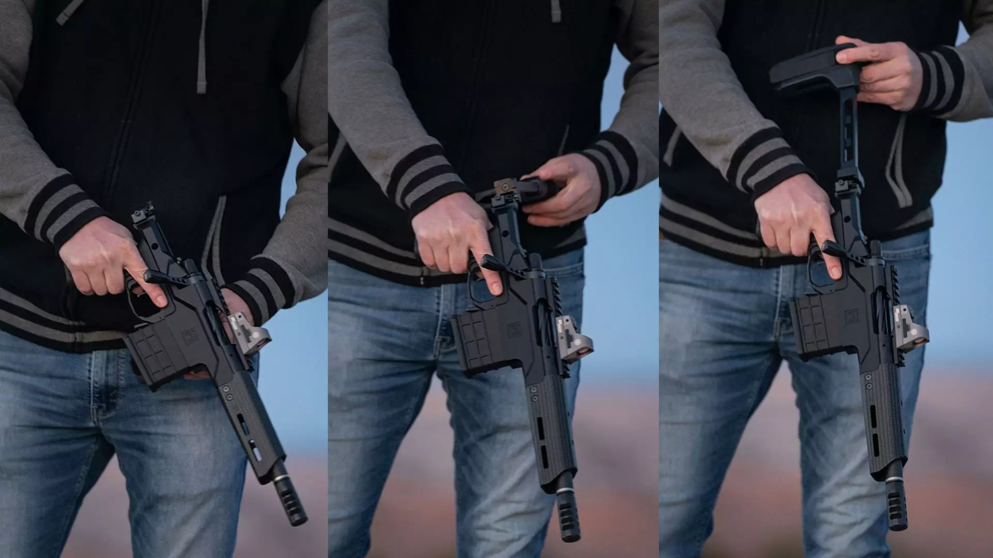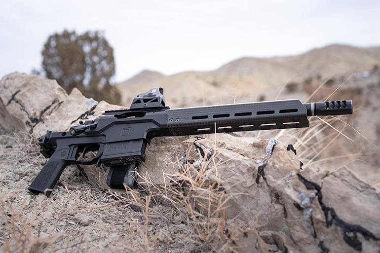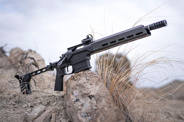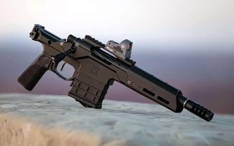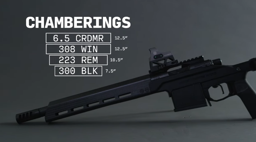但是吧,你这看一下这枪的外形,现代感是没问题了,精度有待确认,手枪这一点你是不是觉得有点假?人家手枪都是9mm、.45ACP之类的手枪弹,这手枪用的是啥?步枪弹。这款枪可选子弹有四种,分别是.300 BLK、.223 Rem、6.5mm Creed、.308 Win,枪管长度从 7.5 英寸到 12.5 英寸不等。另外他还有个大号、向下倾斜的拉机柄,很明显,这是个旋转后拉式枪机的栓动步.......额,手枪。