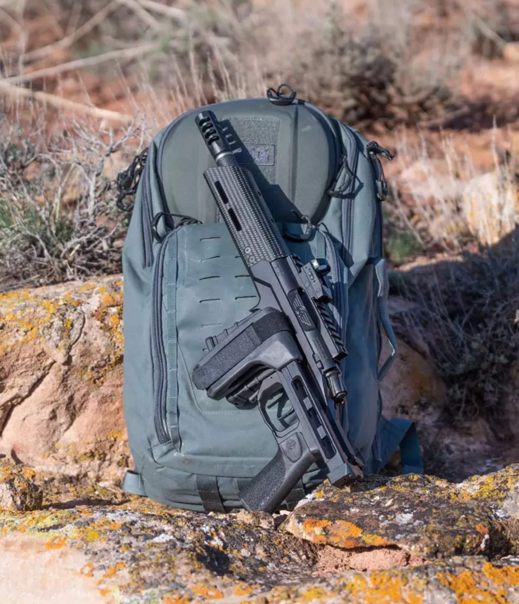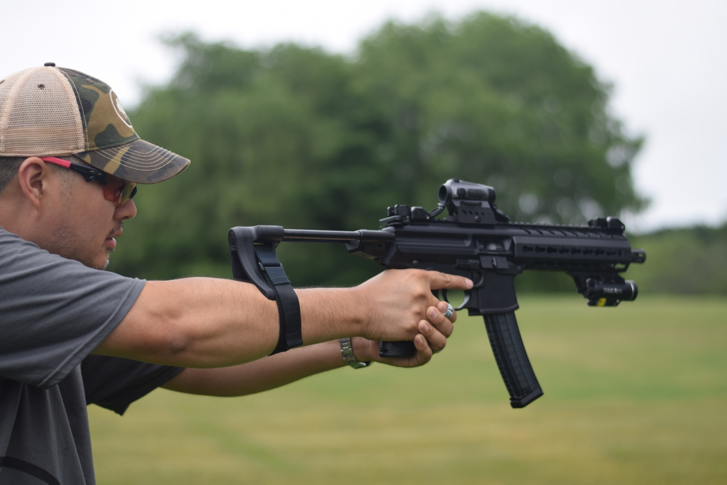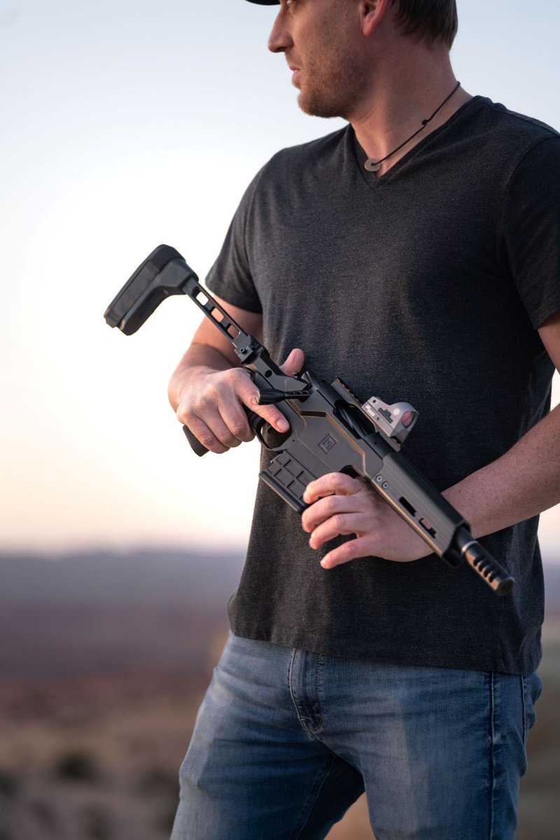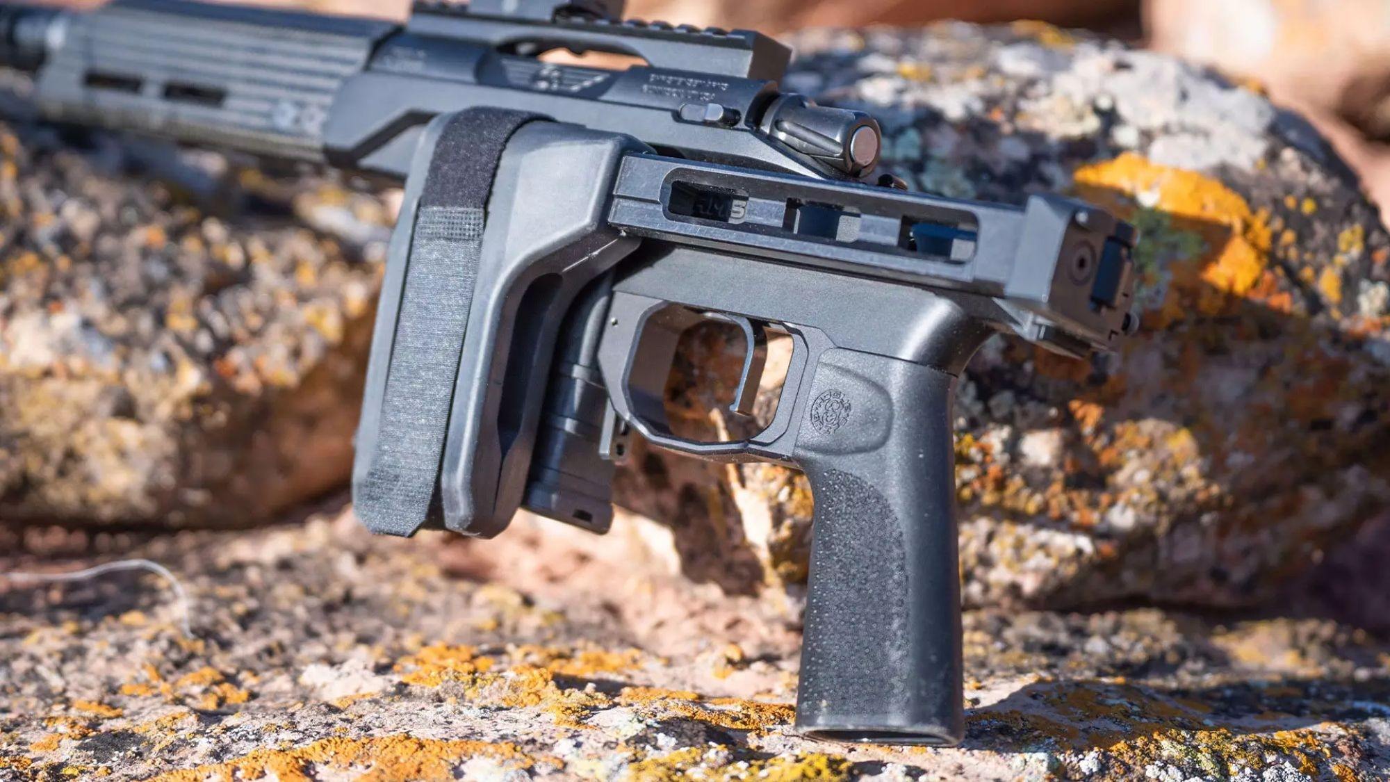 正常手枪的话,单手握持、双手握持射击都没问题,但是这枪怎么说都是一个发射步枪弹的手枪,如果不进行抵肩射击的话,后坐力很难hold住。hold不住后坐力,那这款枪所谓的精确就不复存在了。所以,这枪的机匣尾部增加了可折叠的SB Tactical® FS1913A手枪支架。这是美国很多步枪改的手枪都带的一个东西,原则上是不属于枪托,加在机匣尾部,展开了,也不算是步枪,还是手枪范围内。但是在加州这玩意儿违法,不承认这东西不是枪托。这个所谓的手枪支架,其实就是一个小号的步枪枪托,还是可以抵肩射击的。
