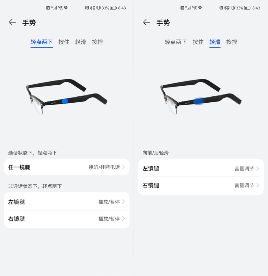 首先说操作,华为智能眼镜支持丰富的手势触控操作,我们可以根据自己的使用习惯来自定义交互指令。