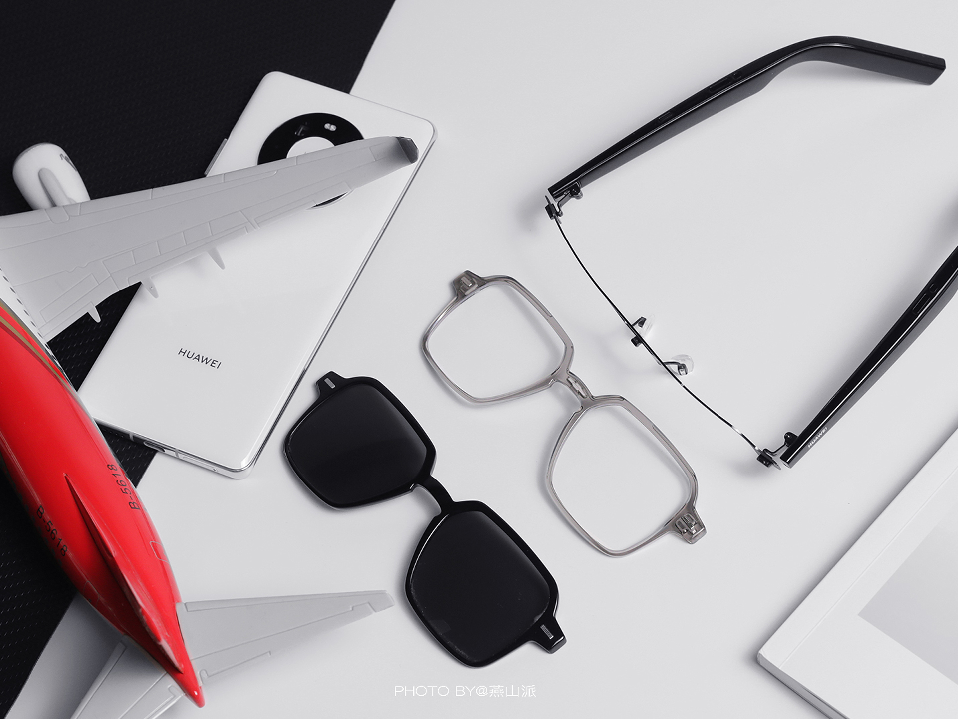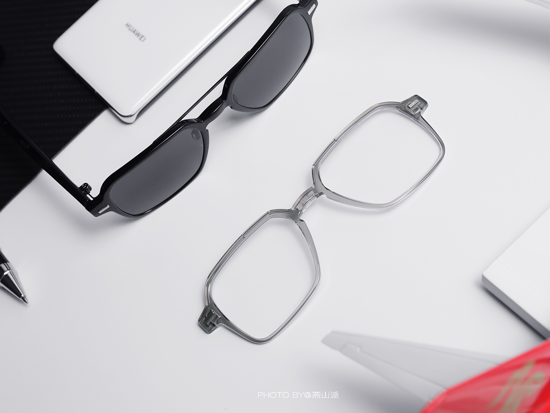 接下来敲小黑板划重点,大家应该见过给光学镜夹太阳镜片的,但是你见过通过拆卸镜框,轻轻松松就能在太阳镜和光学镜之间互换的吗?华为智能眼镜就让我们见识了一次。