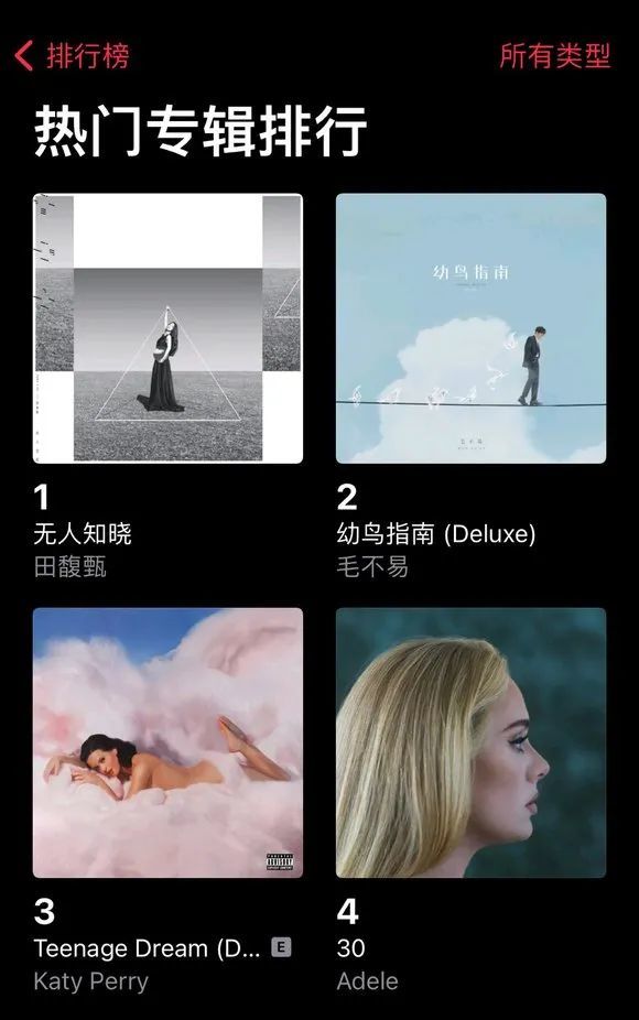 今日,Katy Perry 的专辑《Teenage Dream》中国回春,在Apple Music 上排名全类目第三位,仅次于田馥甄的《无人知晓》以及毛不易的《幼鸟指南》。