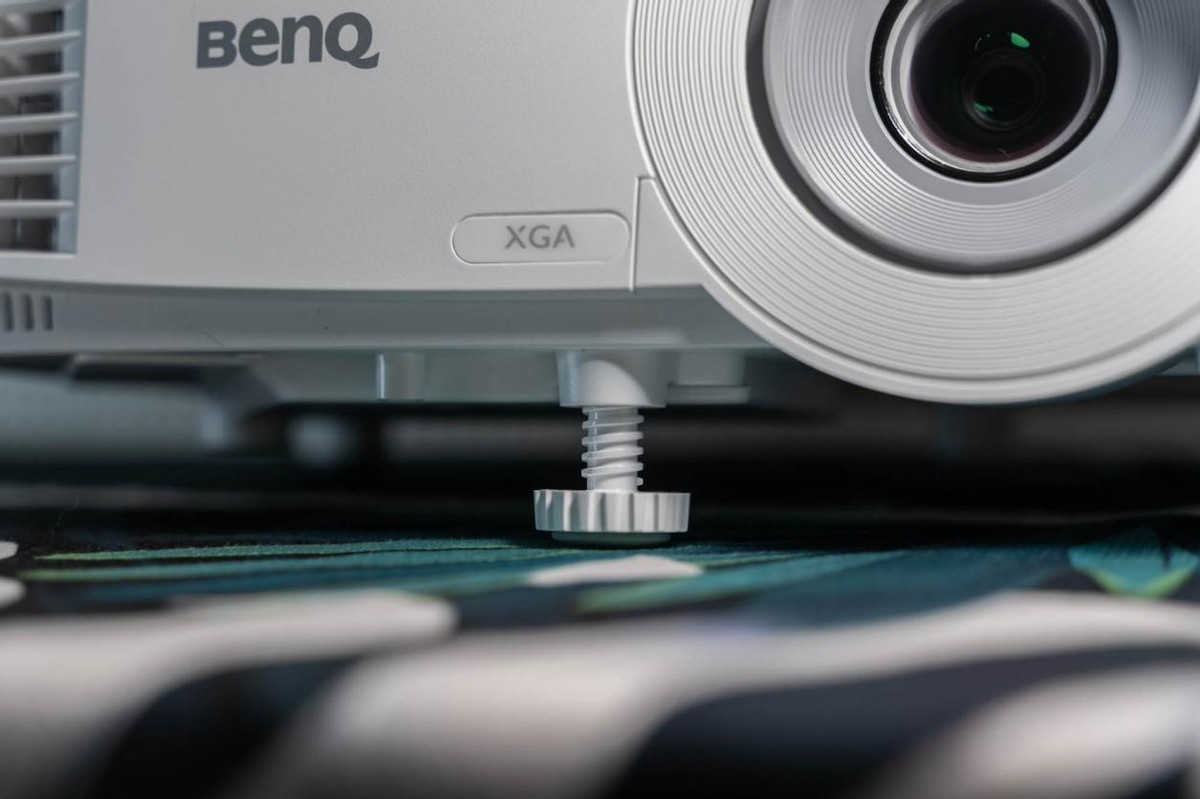 明基MX560正面有全玻璃镜头和出风口,在机身底部配备了2枚可高度升降的脚垫,旋转前侧、后侧带旋钮的脚垫即可将机身抬高,获得更佳的投屏角度。