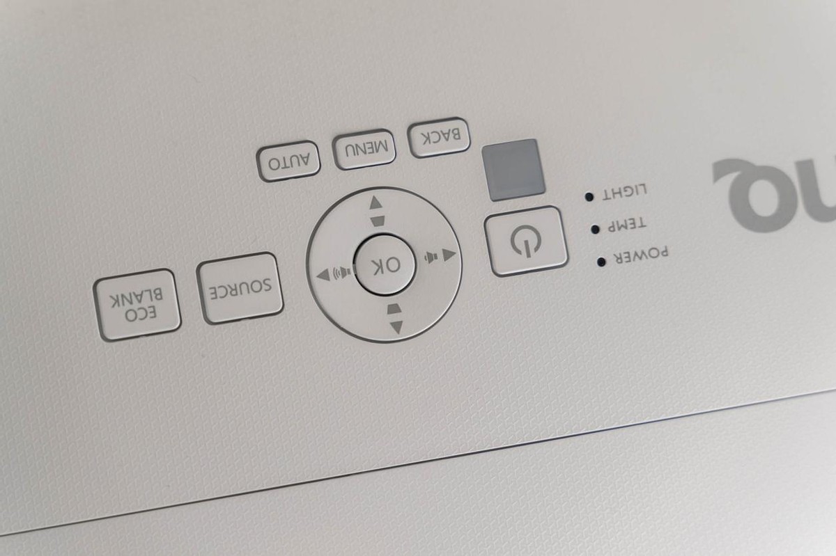 镜头投射比1.96~2.15,投射84寸需要3.29米,100寸需要3.92米,处于标准水平。机内功能配有自动垂直梯形校正功能和梯形畸变校正功能,在投射位置确定后,投影仪会自动调整为方正画面,也可以通过机身顶部的校正按键对画面进行一定程度的微调。