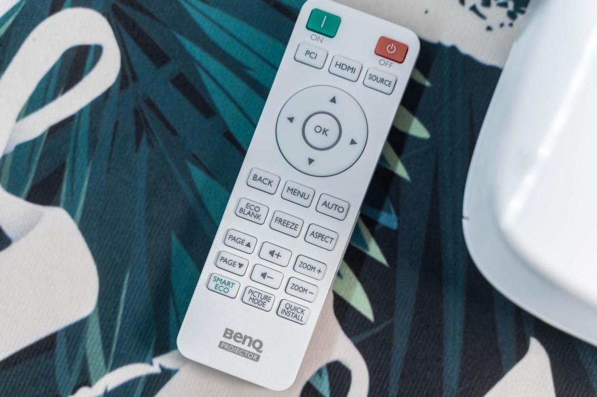 遥控器精巧轻便,机身和遥控器整体都采用了白色,干净且落灰后不明显。磨砂质感+滚花纹理增加了摩擦力,握持遥控器和搬运投影机时都不容易滑落。