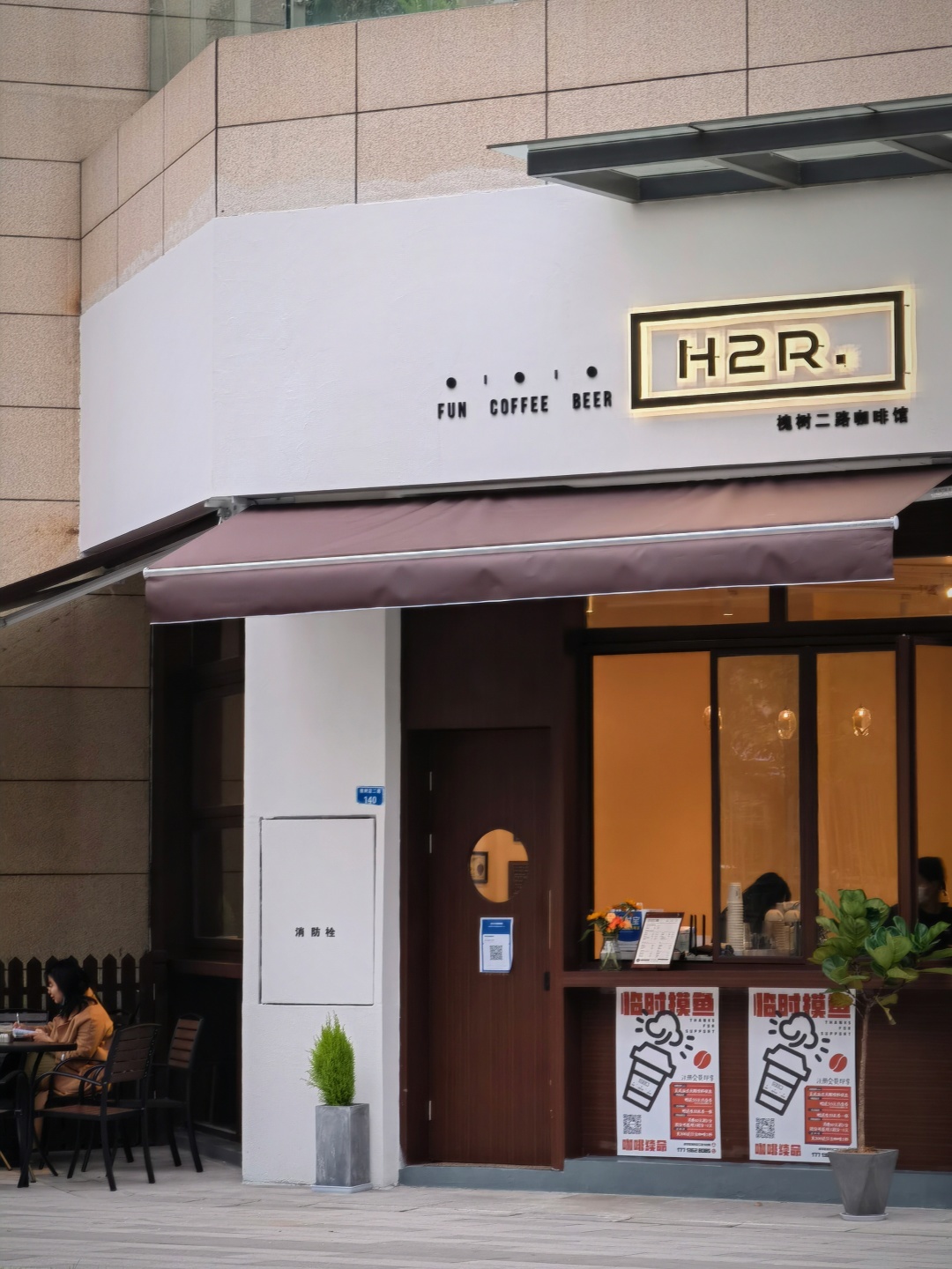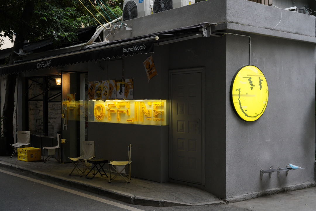 白色的遮阳伞和金属感的搭配清爽干净,仿佛置身海滨城市。浅黄色灯箱搭配暗红色字体,蓝色的墙体和拉闸门、百叶窗的搭配尽显复古,引来不少年轻人驻足打卡。