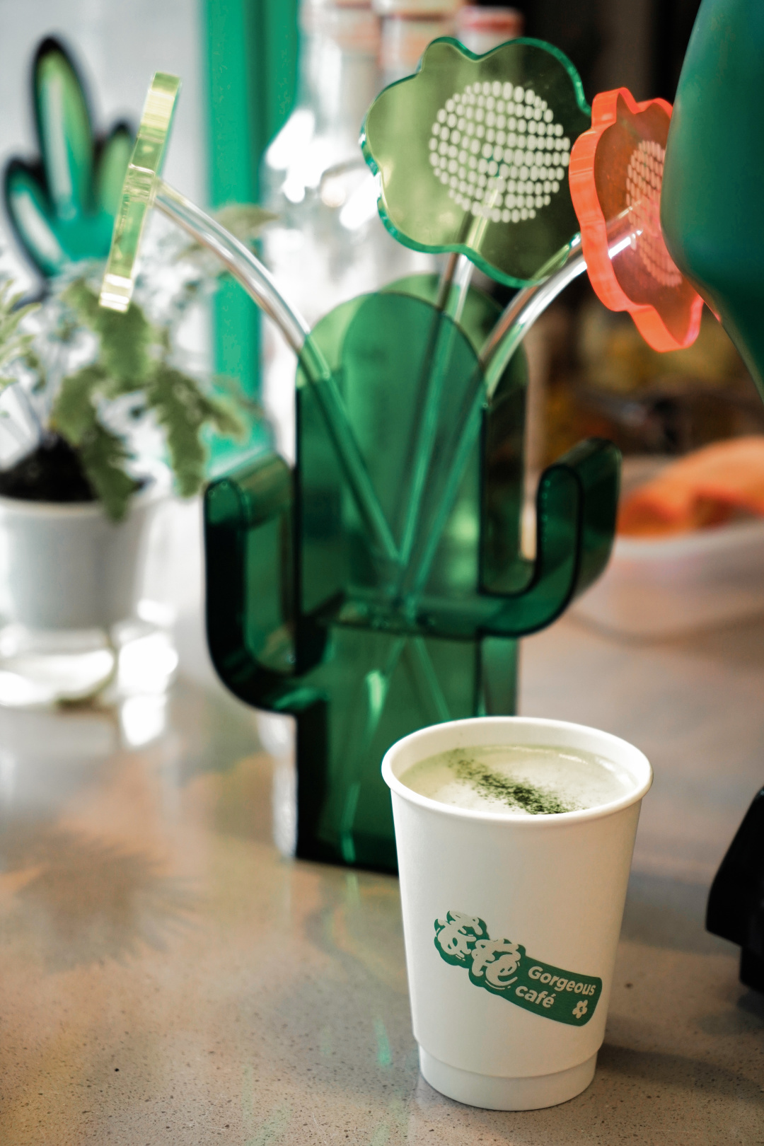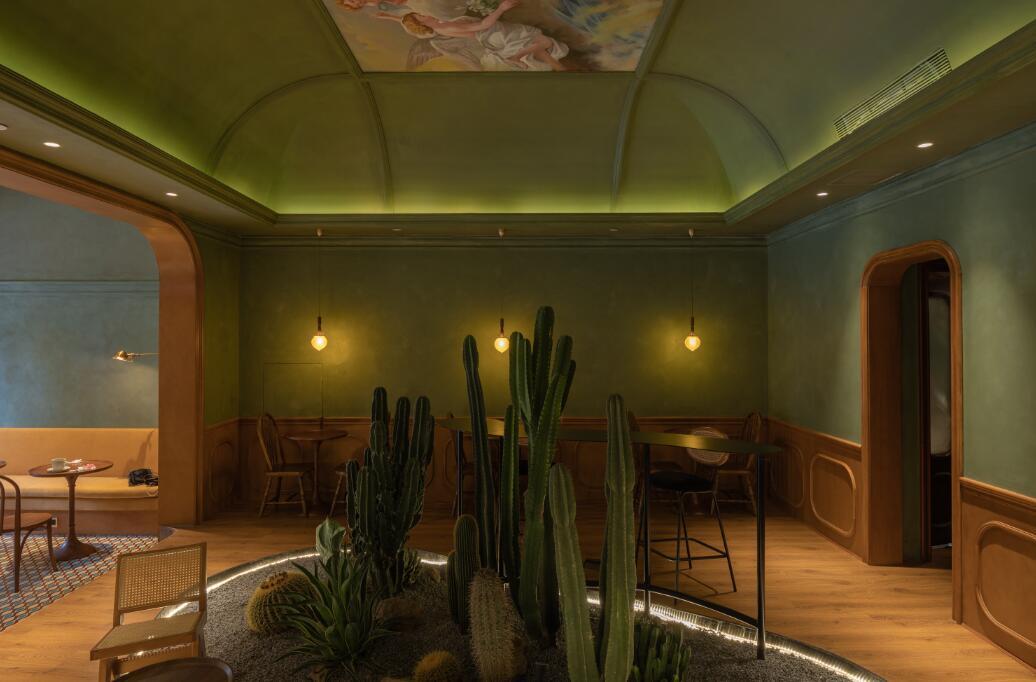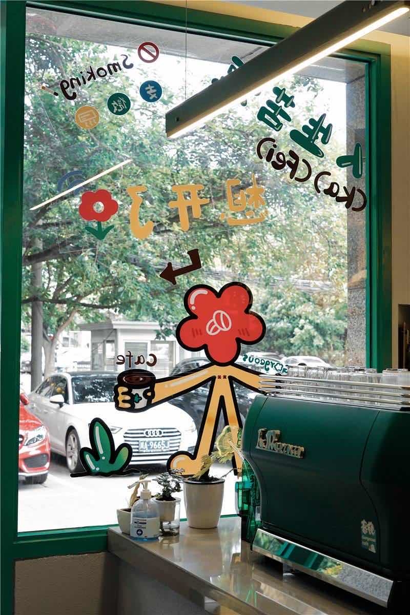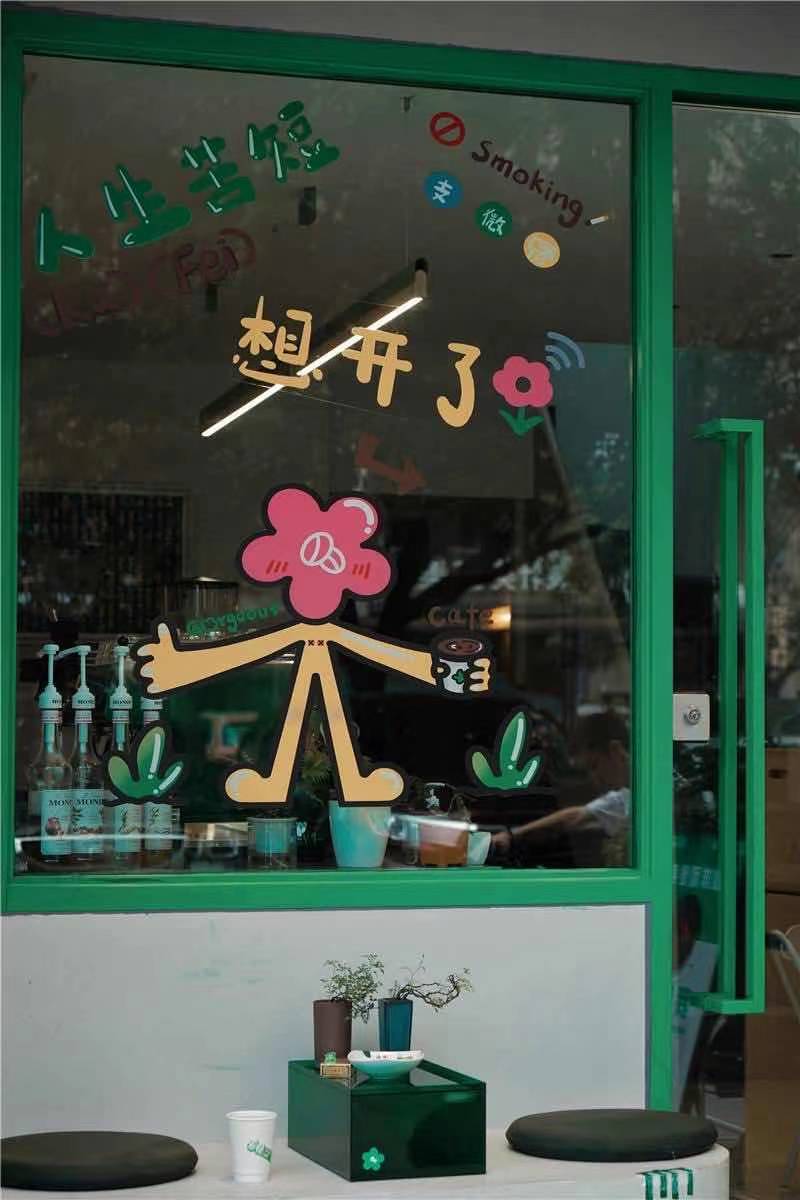 春艳咖啡从头绿到尾:绿色门头、绿色咖啡机,绿色菜单、绿色软装,还搬入鱼缸,用鱼尾搅动一屋的秾艳绿意。