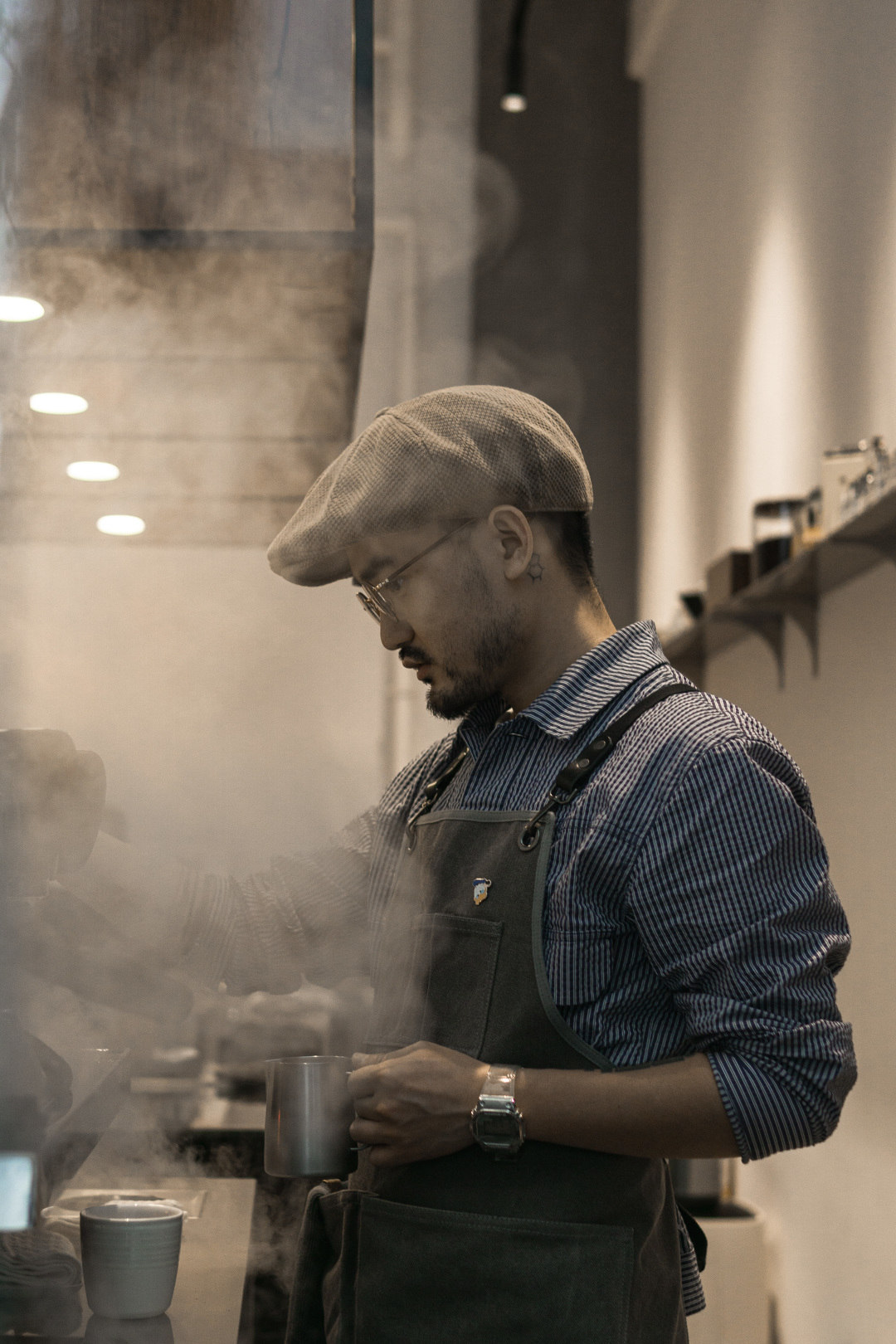 相较于灶咖的内收,彬岛更为开放与绝对,一字排开拉长的吧台上布满手冲壶,可供应的20多种豆单,有如号码牌,一张张悬挂高处,一进抬眼可见,对于产品自信溢出其外,两位帅气的咖啡师站立吧台,严肃接单冲泡。