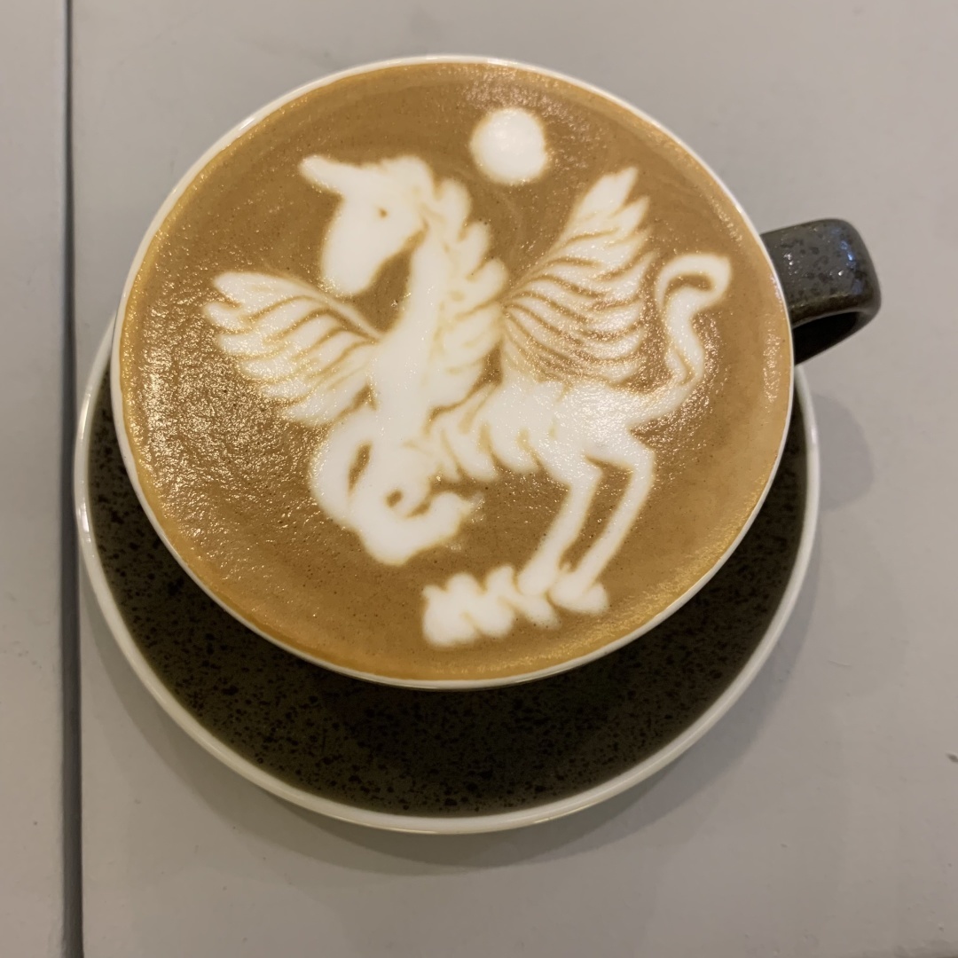 半步便是这样一家,以拉花为卖点的咖啡店,提供各种拉花图案,从普通的心形、枫叶,再到熊猫、独角兽、天鹅、萨摩耶等。这也是主理人吴博面对“拉花都是表面功夫,影响咖啡风味”的质疑的抗衡,他想邀请所有疑虑之人,来店里喝一喝再聊。
