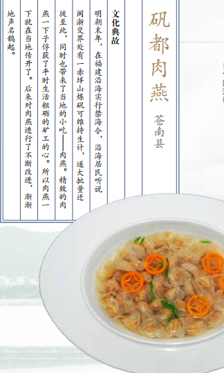 苍南十大碗中有一道矾山肉燕,和“肉包肉” 的福鼎肉燕一样,一份矾山肉燕正宗与否,燕皮才是决定性因素。上好的矾山肉燕燕皮工艺核心在于一个“敲”字。猪肉要用巧劲反复敲打2小时,再配以上好的番薯粉,经过拍、压、 擀、折、拂、扫、切等工序,最后制作成 2毫米的皮。这燕 皮薄如白纸,色泽近玉,口感软嫩,韧而有劲。用这样的燕 皮包上入味的肉馅,再配以鲜香的骨汤,也难怪苍南当地有“无燕不成席” 的风俗。