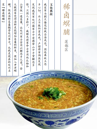 山川秀美,孕育的是绝佳的美味。稀卤螟脯是丽水家喻户晓的名菜,选用的是水发鱿鱼、 夹心肉沫、冬笋、马蹄等天然食材。这道菜卤汁稠浓、滋味醇厚、口味微辣、营养丰富,舀 一口到嘴里,鱿鱼的韧、冬笋的鲜、马蹄的脆, 一齐在嘴里迸发,莲都的山水,就在这一口里。 莲都的美,是动静两相宜的山水,是千年的历史积淀,是我笔画我心的绚烂色彩,更是这一碗藏着莲都人幸福日常的山水滋味。