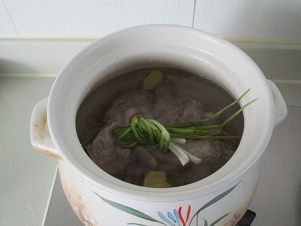 5.砂锅里注入清水,把鸭肉,小葱和生姜片加入