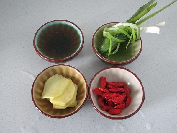 3.准备小葱,生姜片,枸杞子和黄酒