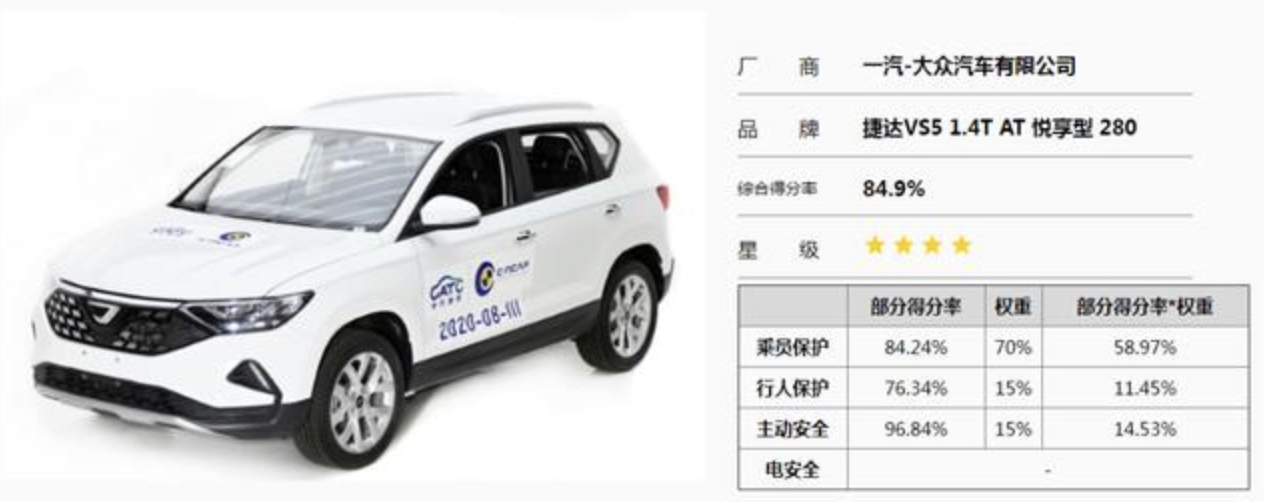 在中汽研C-NCAP 2020年第二批碰撞测试中,捷达品牌首款车型VS5得分率仅为84.9%,获四星评级,同一批其它五款车型均获五星评级,同时,在C-NCAP碰撞测试中只获四星评级的表现确实让人担忧VS5的安全型性。