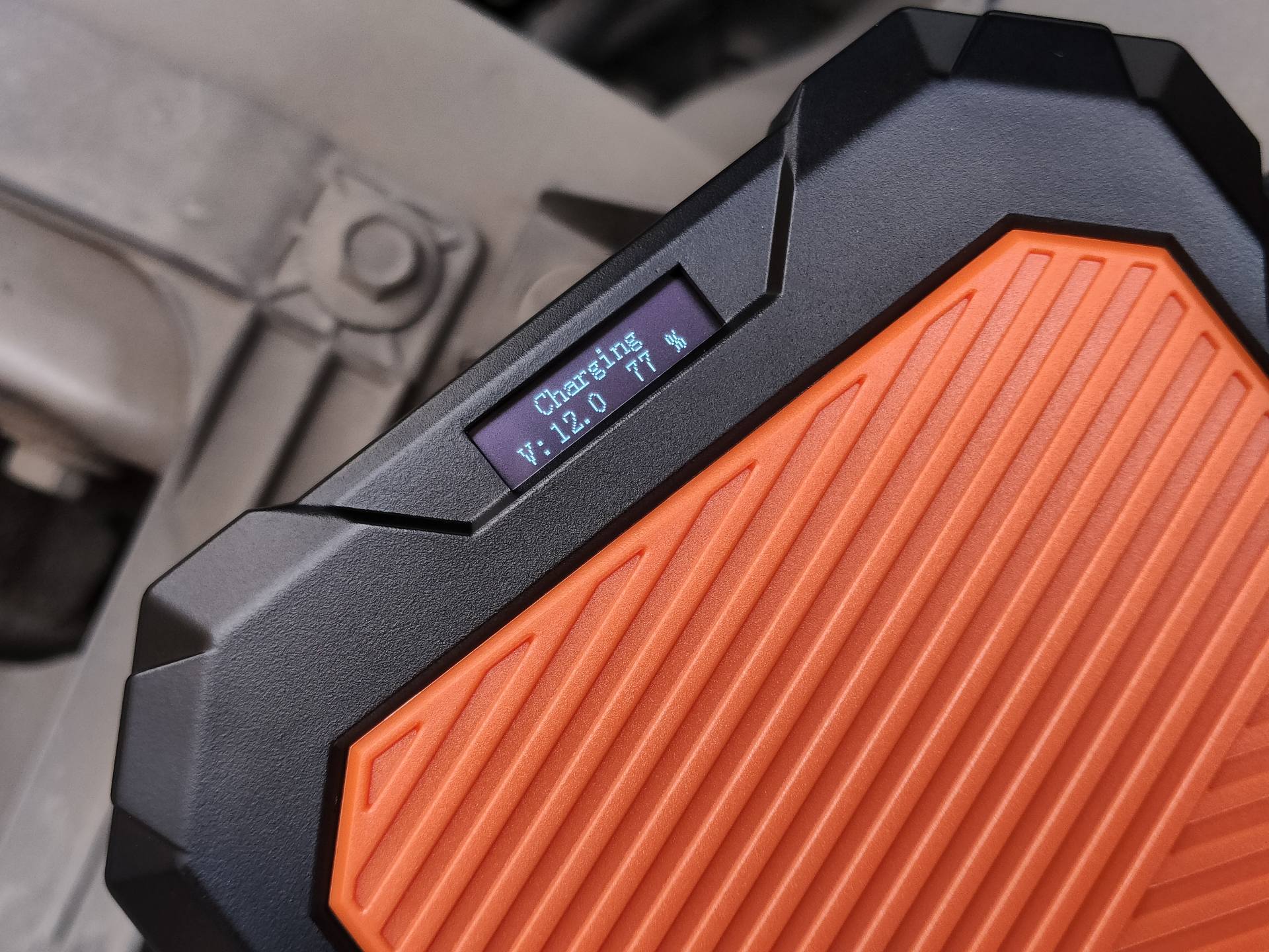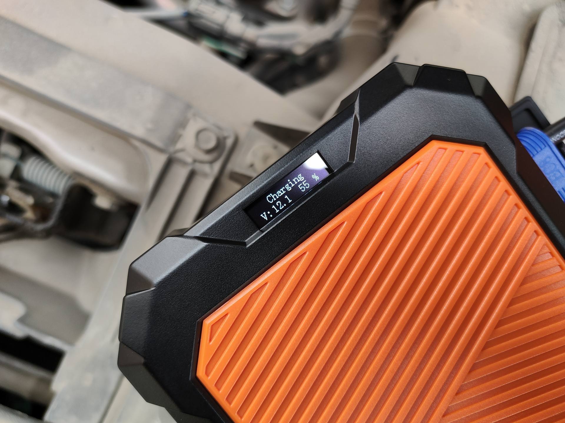 从下图可以看到应急电源正给汽车电瓶充电,电压是12.1V,充电状态55%,一分钟多充电到77%,待完全充满后,屏幕会提示Power On,这时按下电源开关后,应急电源会进入10秒倒计时,屏幕显示Getting Ready,此时你可以回到车内进行打火准备。等到倒计时结束后,应急电源的蜂鸣器会长鸣,就可以直接打火启动了,很方便有没有?