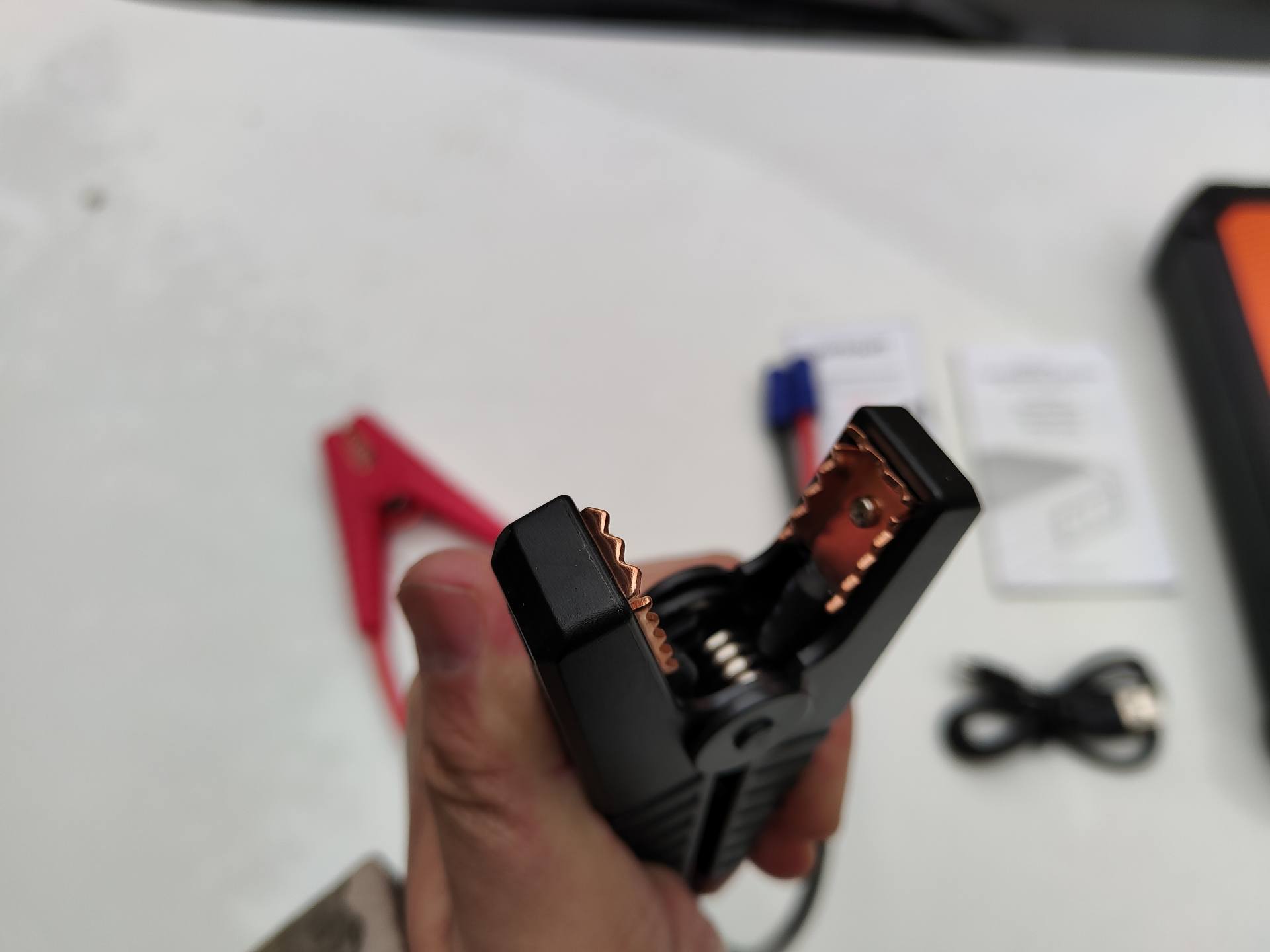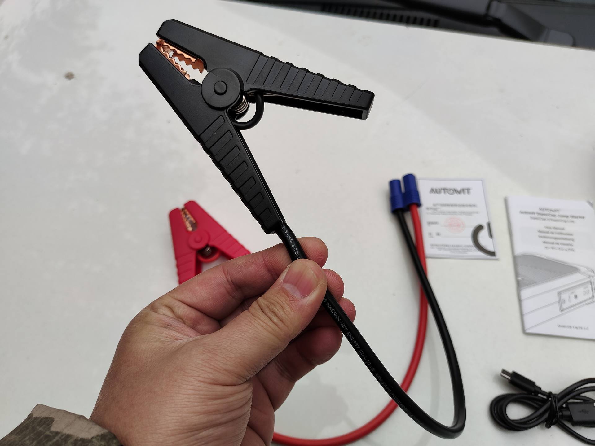 Micro-USB充电线、车载充电器、电瓶鳄鱼夹都可以对Autowit超级电容汽车应急电源进行预充电。鳄鱼夹采用了厚实的线材,具有防火阻燃的效果,夹子嘴采用了纯铜材质,具有更好的导电效能。