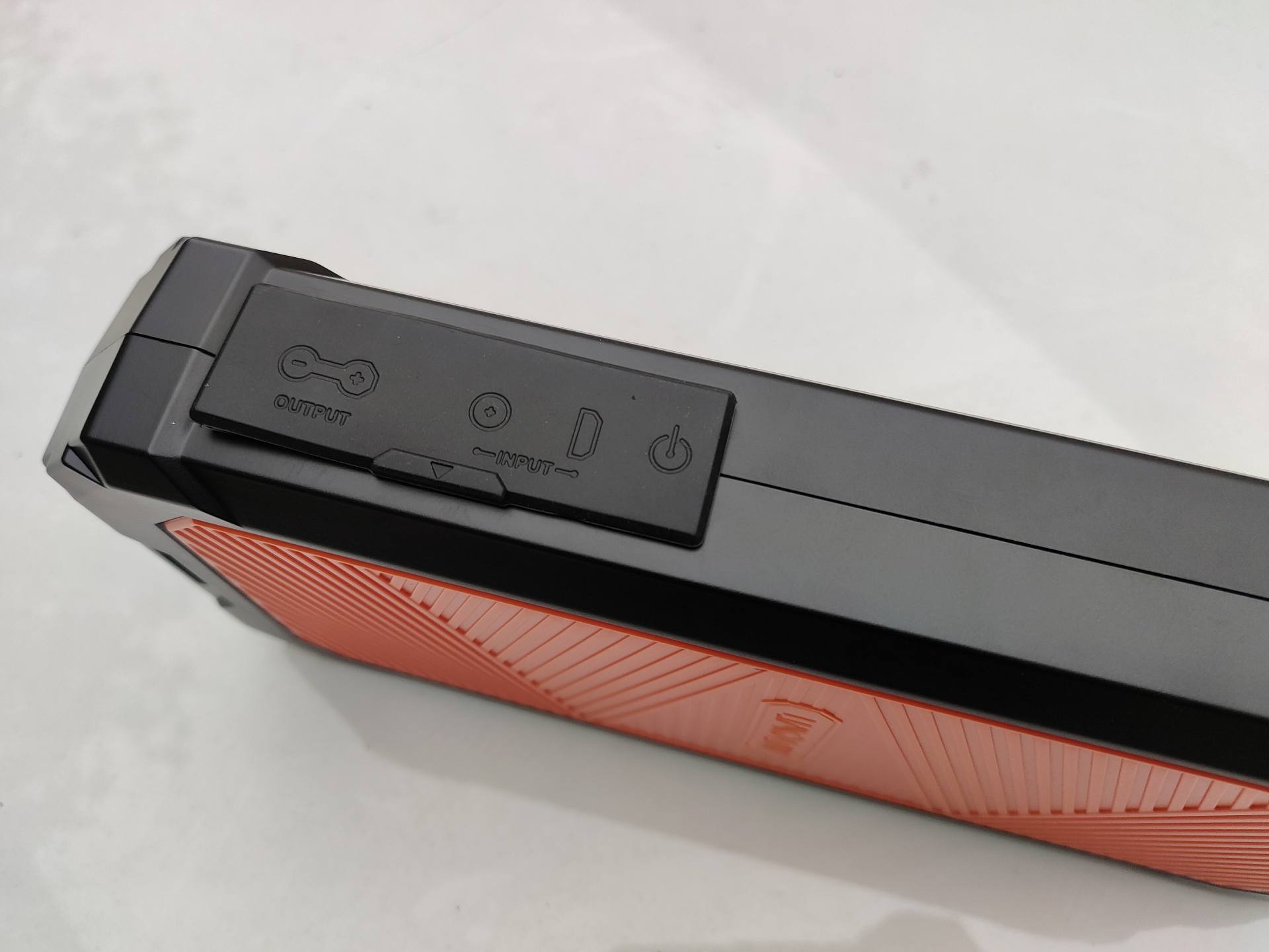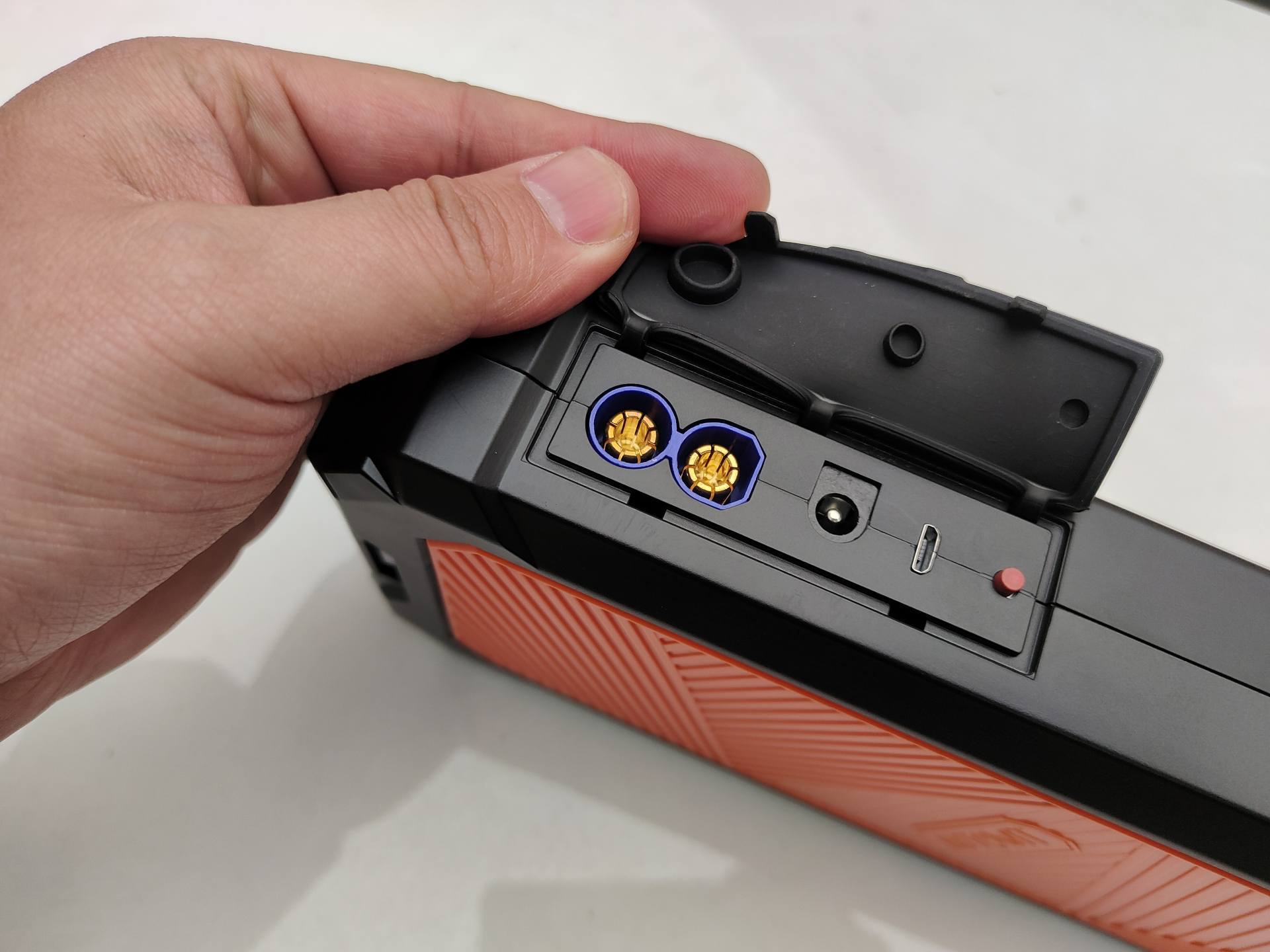 Autowit超级电容汽车应急电源侧面有防水橡胶塞,打开后可以看到连接鳄鱼夹的防呆口、12V DC直流接口、5V Mirco USB接口,红色按键是电源开关。