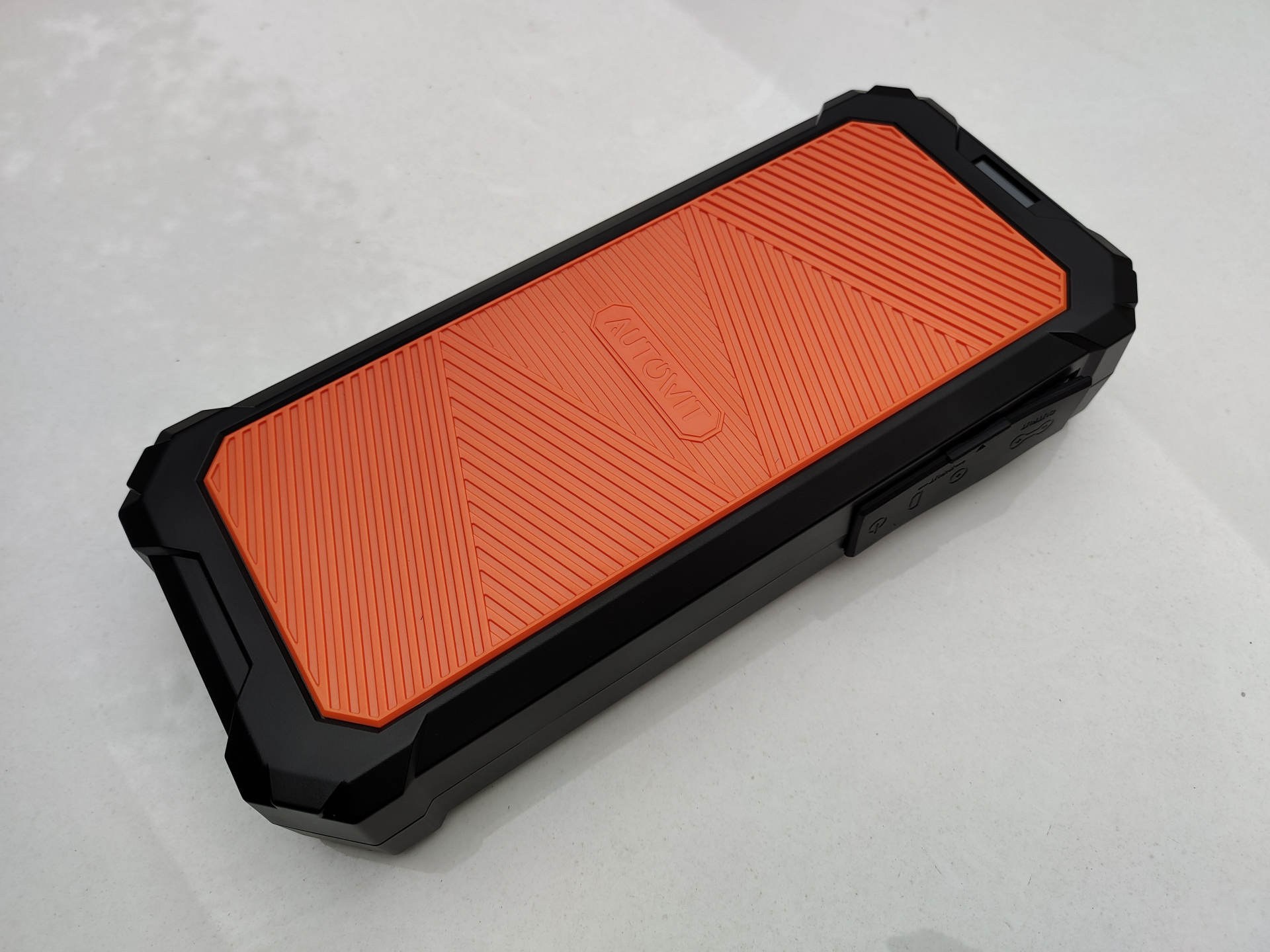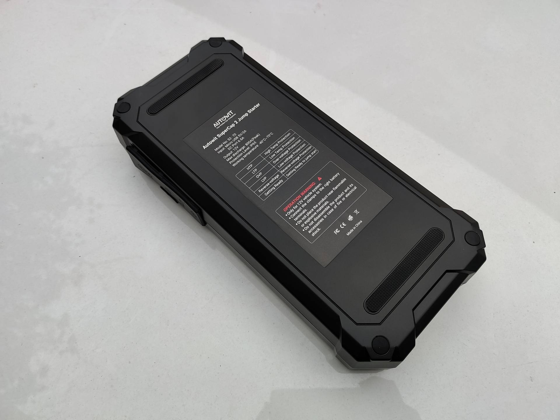 Autowit超级电容汽车应急电源拿到手感觉还是比较重的,尺寸为264*46.4*119mm,净重约0.98Kg,手感和一块砖头差不多,黑橙配色醒目也方便寻找,背面也有参数规格:最大工作电流800A,支持IP65防尘防水,工作环境为-40°-70°,不论哪种极端环境都能正常使用。