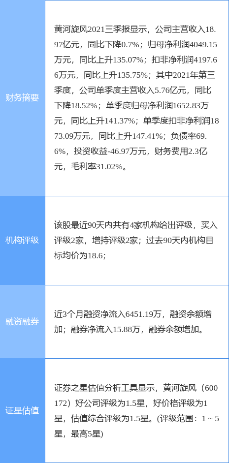 黄河旋风公告,公司于近日收到河南省科学技术厅、河南省财政厅、国家税务总局河南省税务局联合颁发的《高新技术企业证书》,证书编号为:GR202141000508,发证日期为2021年10月28日,有效期三年。