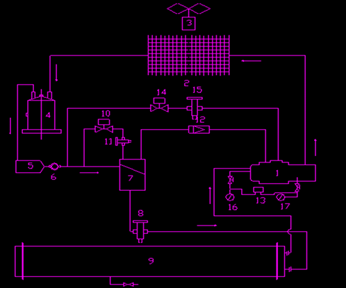 制冷部件:1、压缩机;2、翅片换热器;3、风机;4、高压罐;5、干燥器 6、视液镜;7、经济器;8、电子膨胀阀;9、壳管换热器;10、14、电磁阀; 11、15、热力膨胀阀;12、单向阀;13、压力控制器;16、17、压力表。