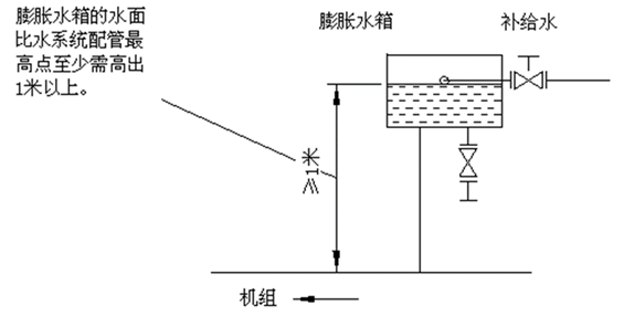 6、采用密闭回路式水系统时机组回水处应设置膨胀水箱,以缓冲因水体积的膨胀或收缩现象以及隔离补给水压对水配管的影响。