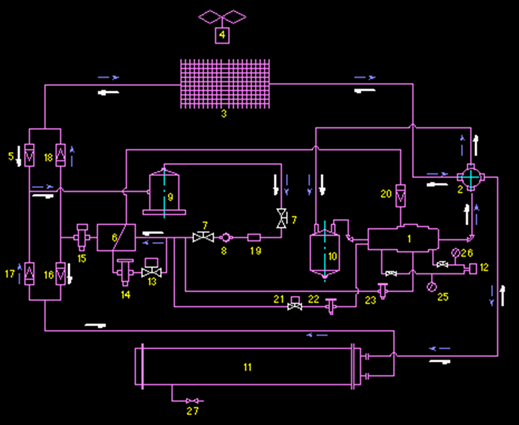 1.压缩机;2.四通阀;3.翅片换热器;4.风机;5.16.17.18.20.单向阀; 6.经济器;7.截止阀;8.视液镜;9.贮液器;10.汽液分离器;11.壳管换热器 12.压力控制器;13.21.电磁阀;14.22.23.热力膨胀阀;15.电子膨胀阀;19.干燥过滤器;25.26.压力表。