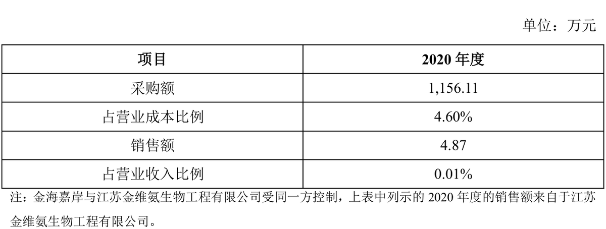 对此,招股书中称,金海嘉岸为公司的供应商,公司向其采购组氨酸。2020 年,金海嘉岸关联方江苏金维氨生物工程有限公司向公司采购了4.87万元颗粒硫辛酸,金额较低,江苏金维氨生物工程有限公司主要从事保健品(软胶囊、硬胶囊、片剂、粉剂、颗粒剂、丸剂)的生产与销售,其采购公司颗粒硫辛酸主要用于生产复合氨基酸类保健品向下游客户销售,具有合理商业背景。