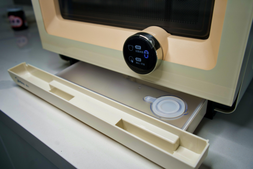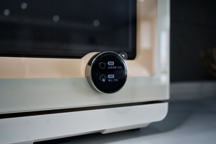 以表面为显示屏的黑色机械旋钮进行色彩点缀,让美的微蒸烤料理炉在温柔尽显的同时,还不失科技感。