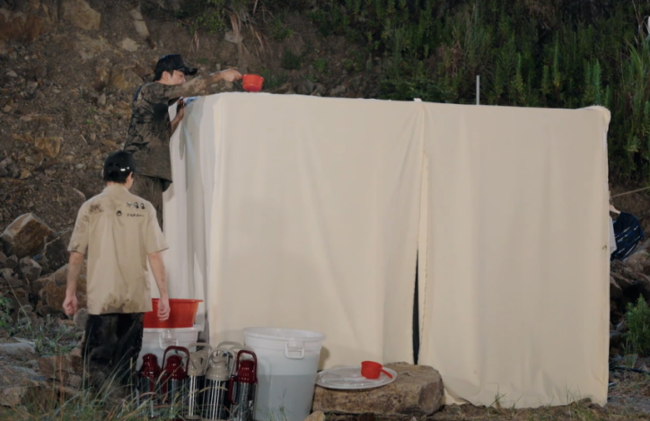 但,夸张的是,节目准备的澡堂子,是露天的。五哈团还得自己整个露天互助洗澡,这画面也是没谁了。