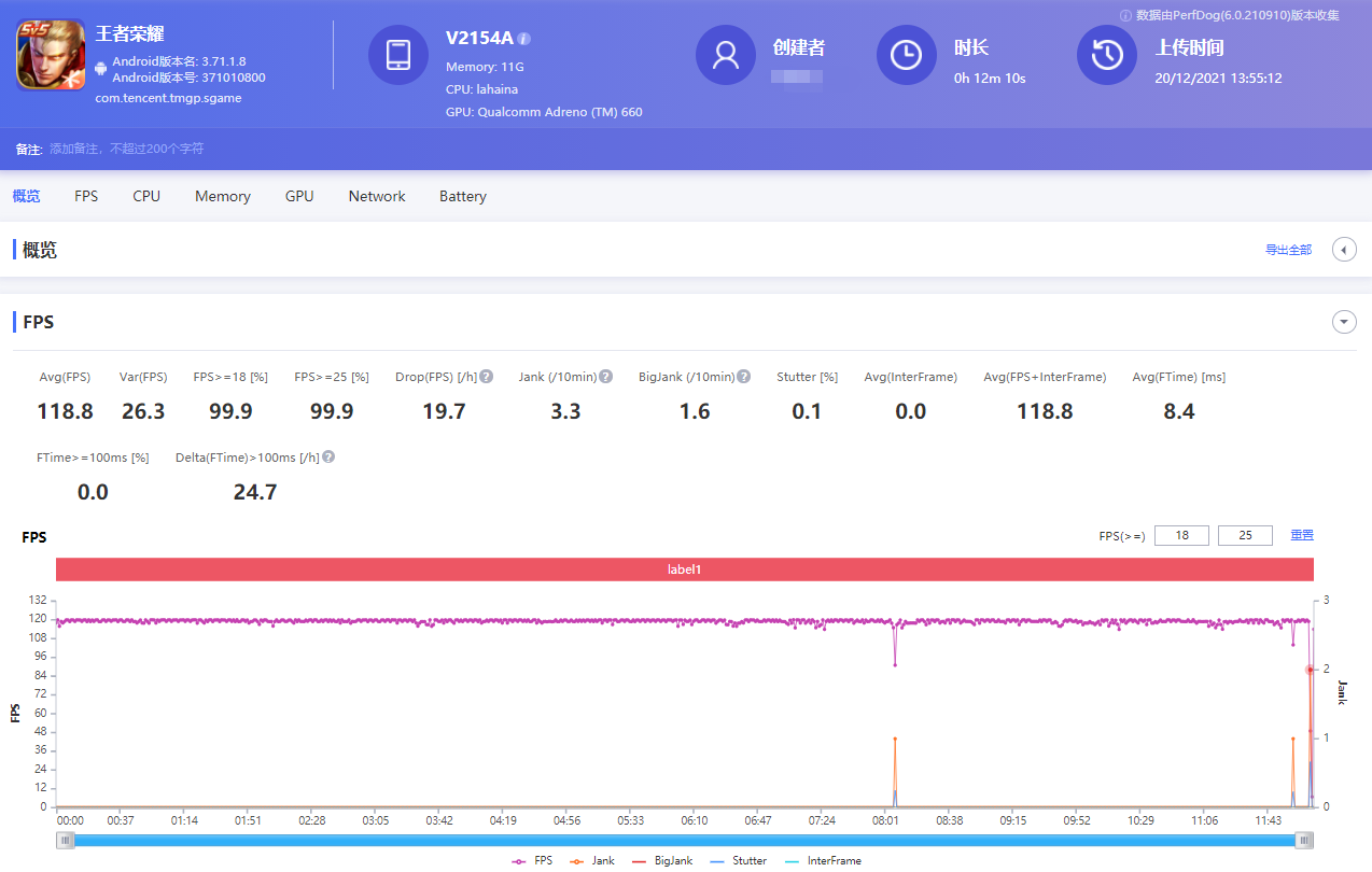 120Hz高刷新率也不是“说说而已”,在支持高帧率运行的游戏中优势尽显。有高通骁龙888的支撑,帧率稳定性也无可挑剔。开启测试软件后进行一把《王者荣耀》游戏,可以见到帧率稳定在平均118.8Hz,游戏中自然可以感觉到画面的流畅度。