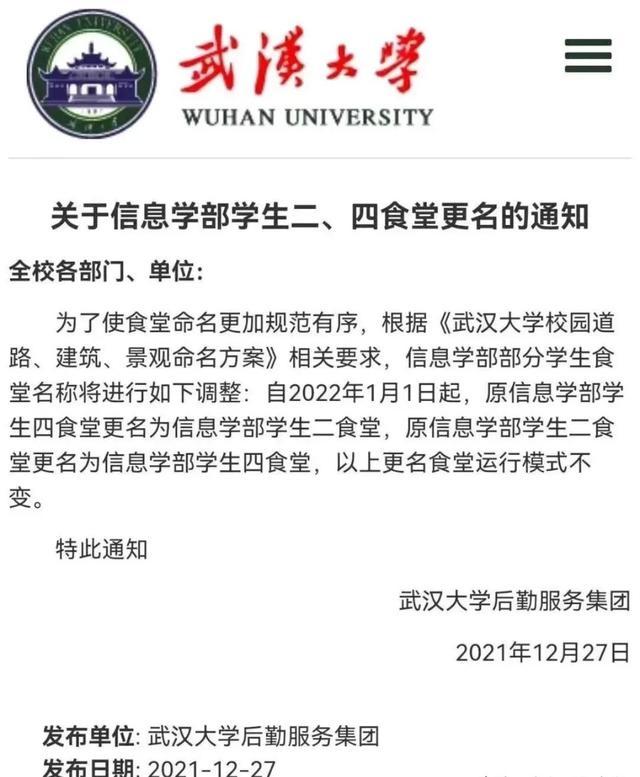 12月27日,武汉大学后勤服务集团发布一则通知,通知中表示,“自2022年1月1日起,原信息学部学生四食堂更名为信息学部学生二食堂,原信息学部学生二食堂更名为信息学部学生四食堂,以上更名食堂运行模式不变。”