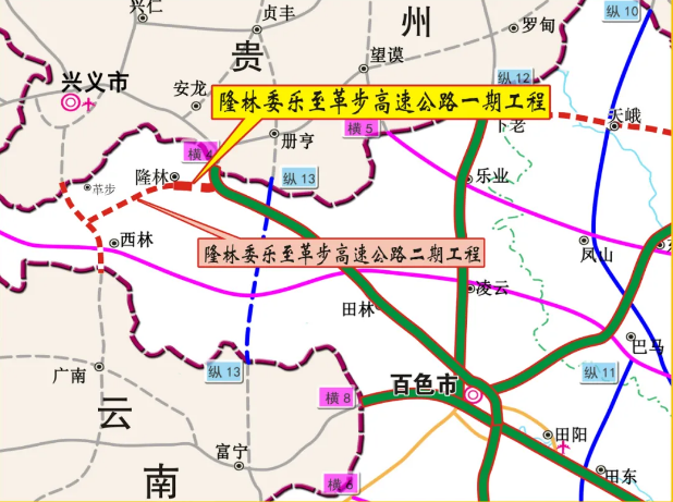 隆林委乐至革步高速公路一期工程位于百色市隆林各族自治县境内,是《广西高速公路网规划(2018-2030年)》中“联19”隆林委乐-西林-广南的重要组成部分。项目起点位于隆林县平班镇委乐村附近,设置隆林枢纽互通接G78汕头至昆明高速公路,由东向西,途经南希屯、南卡界屯、南陇屯,终点位于隆林县城东南侧那他屯附近,设置隆林东互通立交连接隆林县在建鹤东大道。