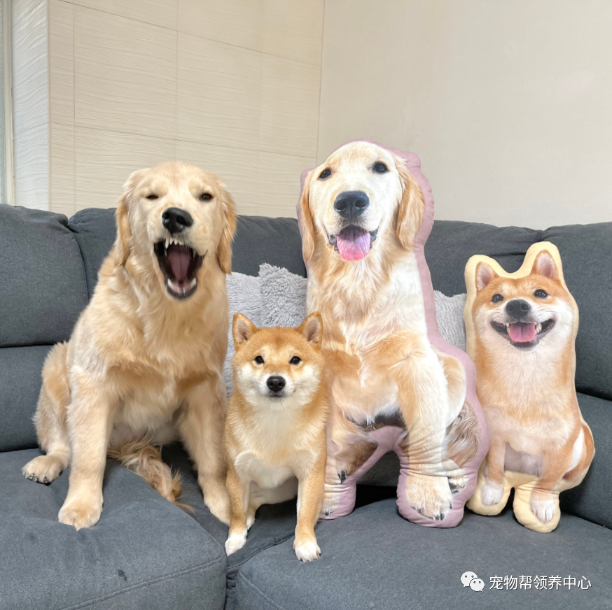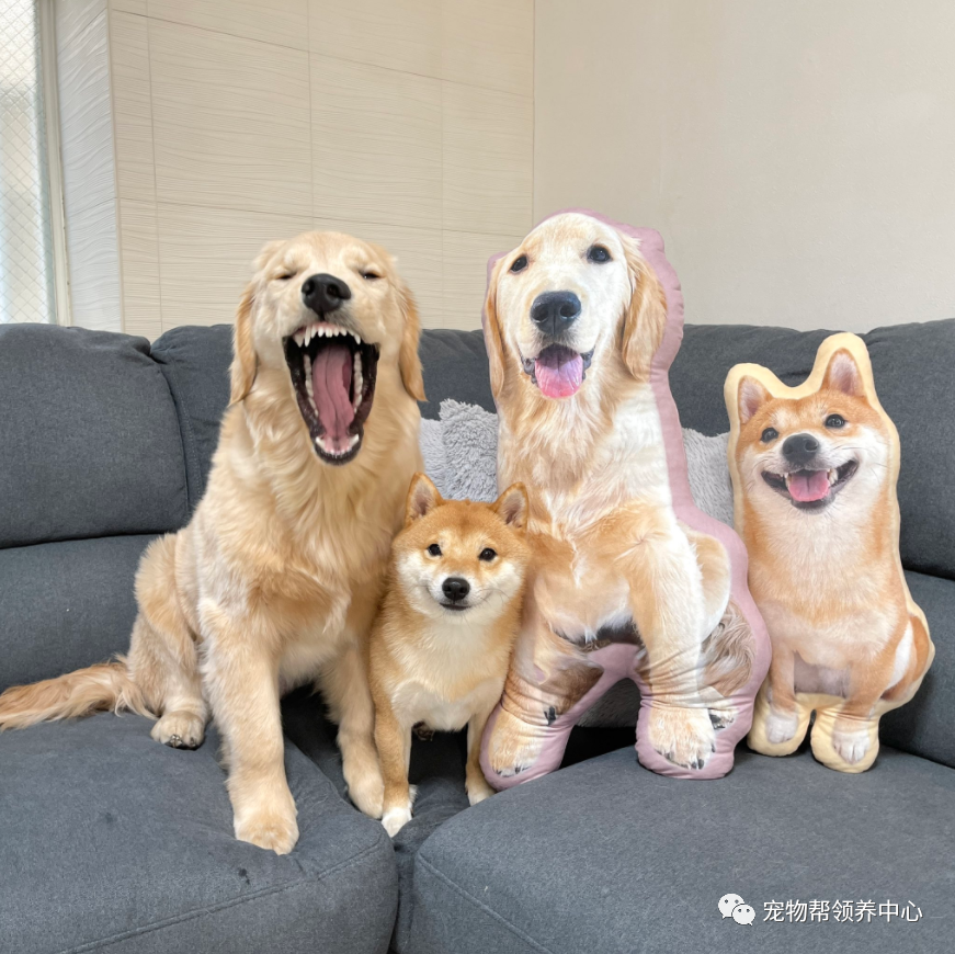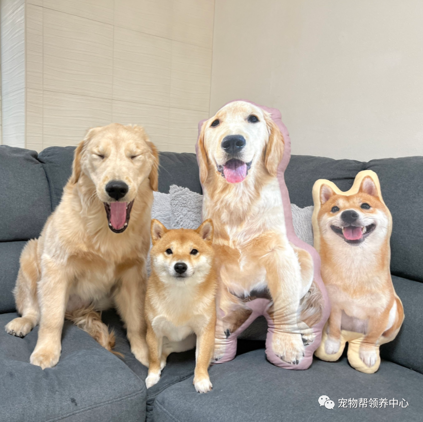 近日主人更是为它们都分别定制了等身大抱枕,然后想拍个大合照留念,结果金毛却总像故意捣乱似的,一直做奇怪的鬼脸。