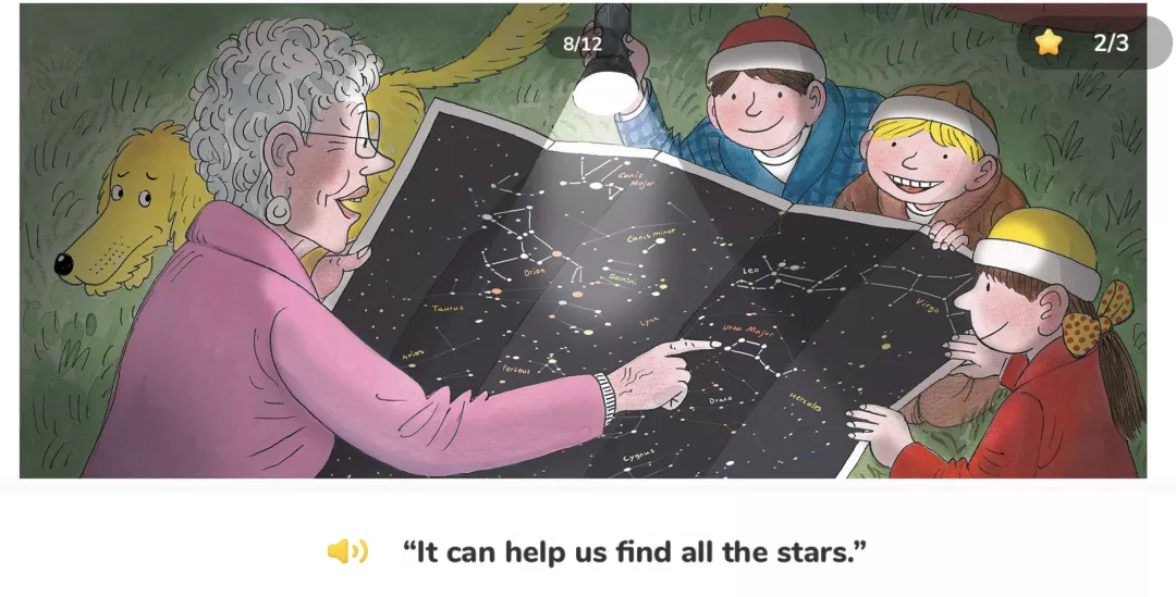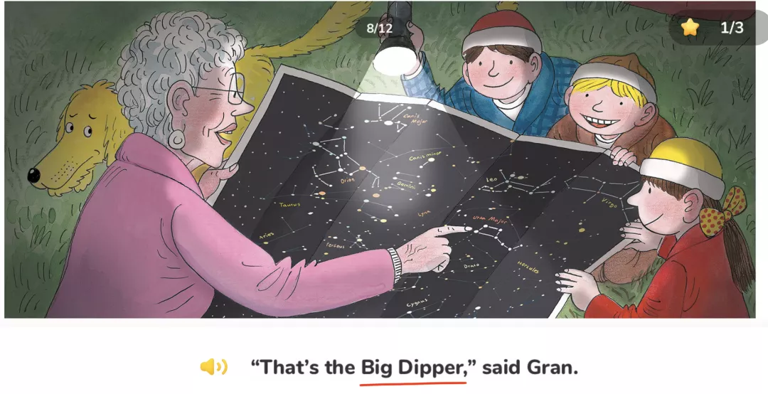 比如下面“牛津树”这一页提到的“Big Dipper”,读到这里孩子可能是懵的,会着急地问家长,“Big Dipper是什么啊?”
