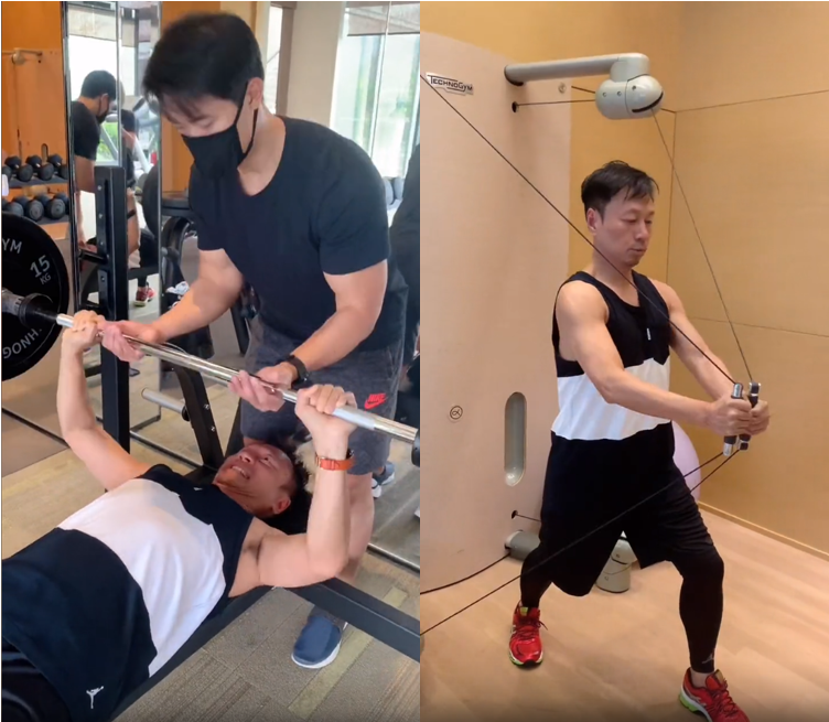 照片中,黎耀祥在教练的指导下举着杠铃,只见他穿着一件黑白运动背心,脚踩红色运动鞋,躺在卧推椅上,十分用力地举起杠铃,一套动作一气呵成,行云流水,可见平日里经常锻炼身体。