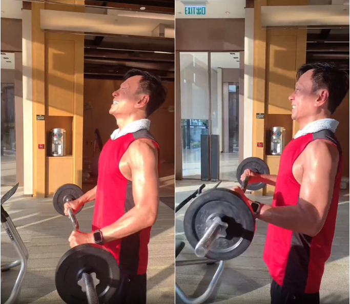 而在黎耀祥一个人拉举杠铃时,明显就更加费劲,只见他咬牙坚持着,脸都被憋到通红,汗水从额头上滴落,十分地辛苦。
