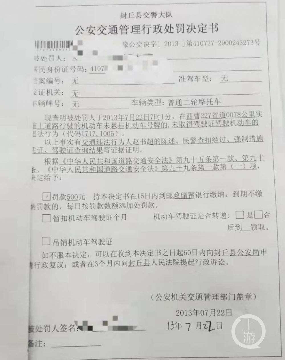 ▲赵甲小无证驾驶无牌摩托被查,报名字时说赵甲大,交警不加以核实,上传公安网。图片来源/受访者供图