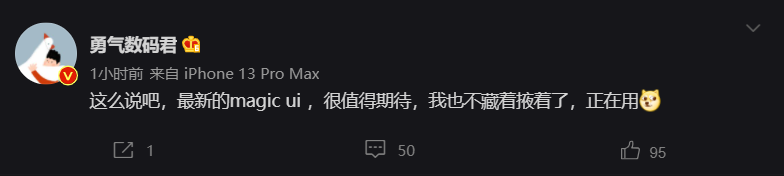 @勇气数码君 表示,他正在使用最新的 Magic UI。“不是鸿蒙,类似鸿蒙。”