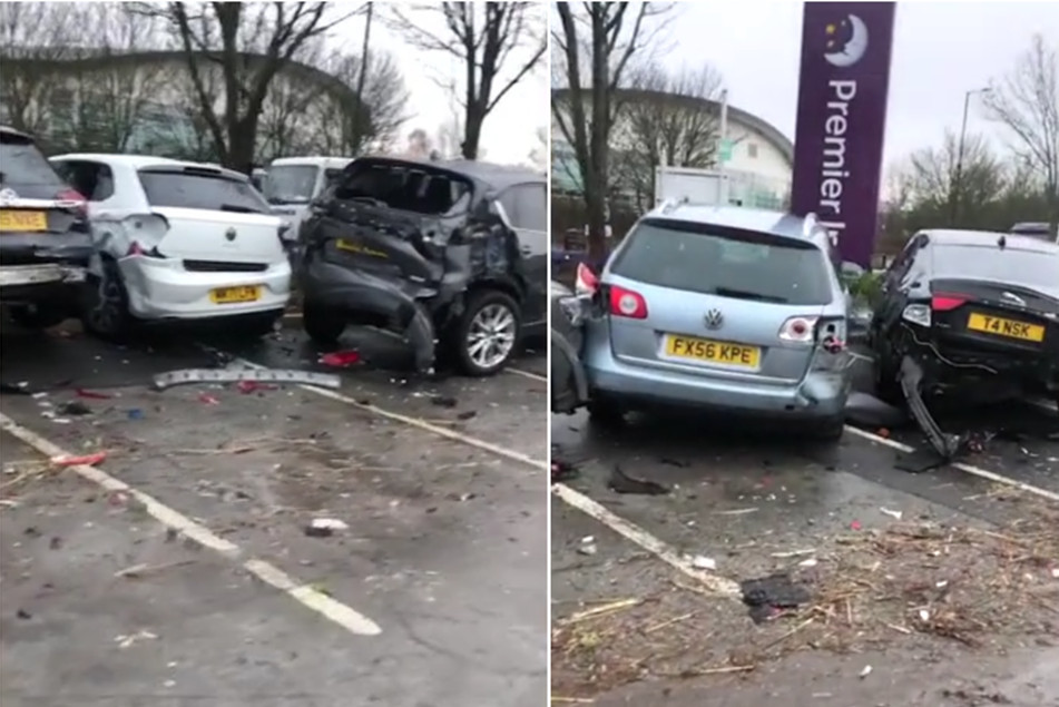 据英国《每日邮报》12月29日报道,英国南约克郡唐卡斯特一辆重型货车28日失控冲过隔离带,撞向酒店停车场,导致17辆汽车受到不同程度的损坏。