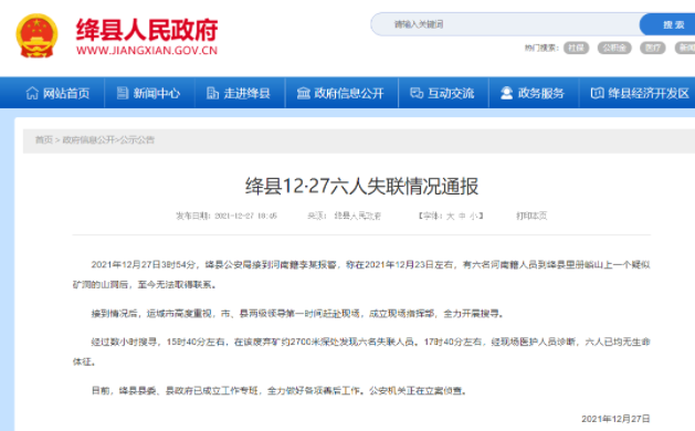 12月27日3时54分,山西运城绛县公安局接到报警,称12月23日左右,有六名河南籍人员到绛县里册峪山上一个疑似矿洞的山洞后,至今无法取得联系。