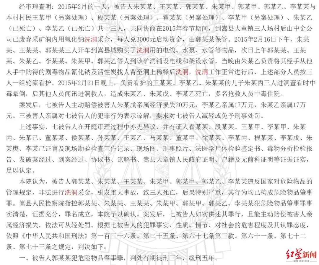 ▲2015年,河南洛阳嵩县郭某某等13人非法“洗洞”,致3人氰化物中毒死亡