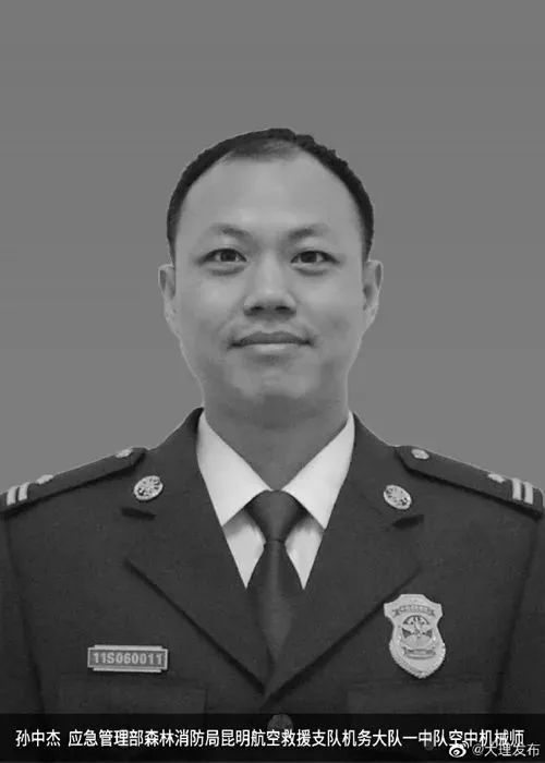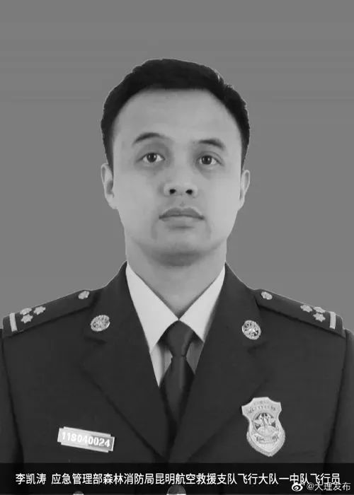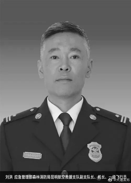 刘洪、李凯涛、刘超、孙中杰 ,生前应急管理部森林消防局昆明航空救援支队飞行人员。5月10日10时20分许,在大理市湾桥镇湾桥村大沙坝山森林火灾清守火场增湿作业中,刘洪机组所在的直升机在取水过程中意外坠入洱海,刘洪、李凯涛、刘超、孙中杰4名机组人员不幸遇难。