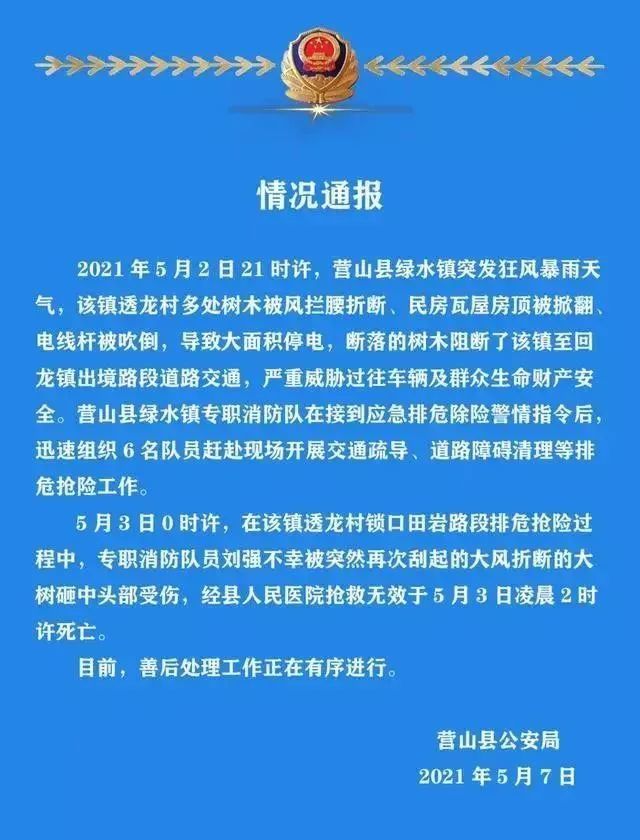 刘强,四川省南充市营山县绿水镇专职消防队队员。男,四川省南充市营山县绿水镇人。2016年10月参加消防工作,2020年7月入党,中共预备党员。2021年5月3日0时许,在营山县绿水镇透龙村锁口田岩路段排危抢险过程中,不幸被突然再次刮起的大风折断的大树砸中头部受伤,经抢救无效于5月3日凌晨2时许牺牲,年仅32岁。