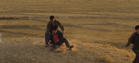 夕阳下三个男孩在荒野上嬉闹打滚,泥沙飞扬,一旁的麦苗啃着油饼,咧开嘴笑得多动人。