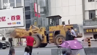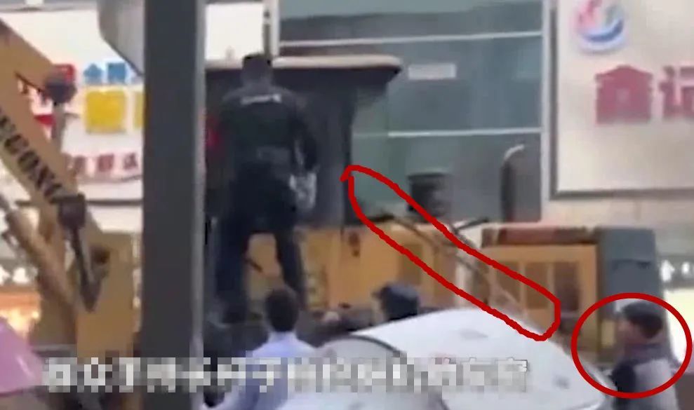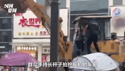 只见一位勇敢的特警兄弟,跳上了铲车,拿着一个不明物体,一下一下的杵司机(也可能是在喷辣椒水)。。。