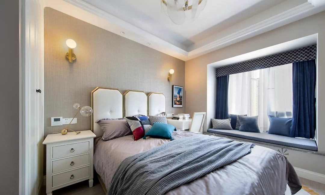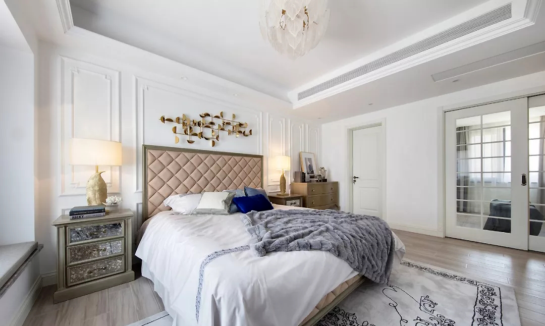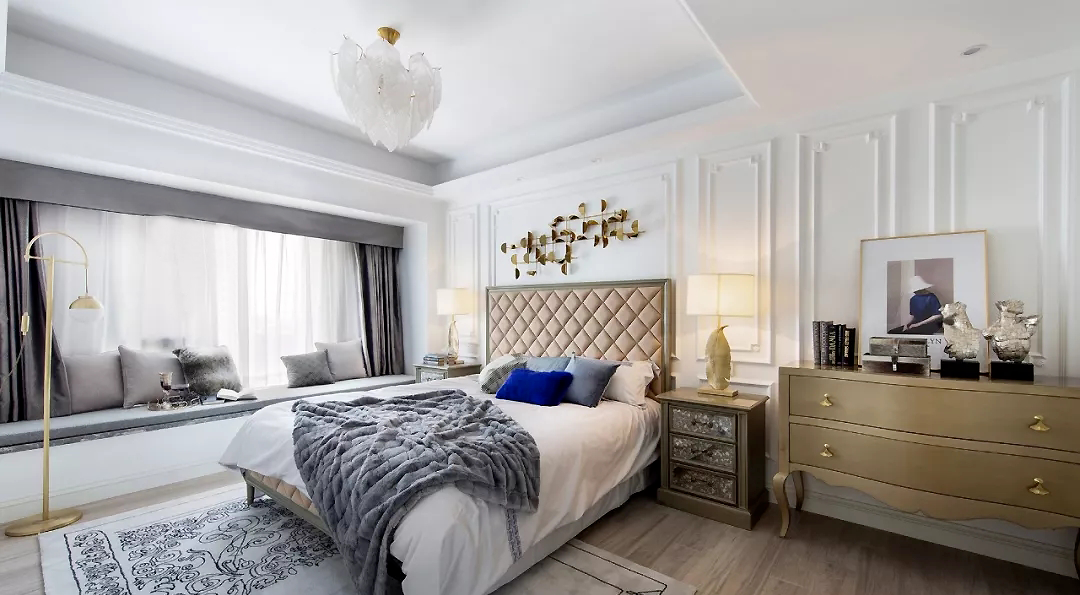 主卧用色整体上更明亮一些,配合灰色的布艺窗帘以及随处可见的金色元素,让空间的色彩层次丰富起来。纯白的墙面加上美式的线条,高高的床背与金色饰品在两侧暖黄色灯光的映衬下,尽显高贵典雅。