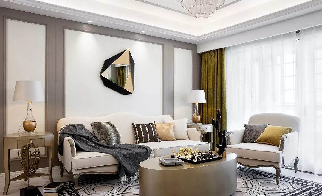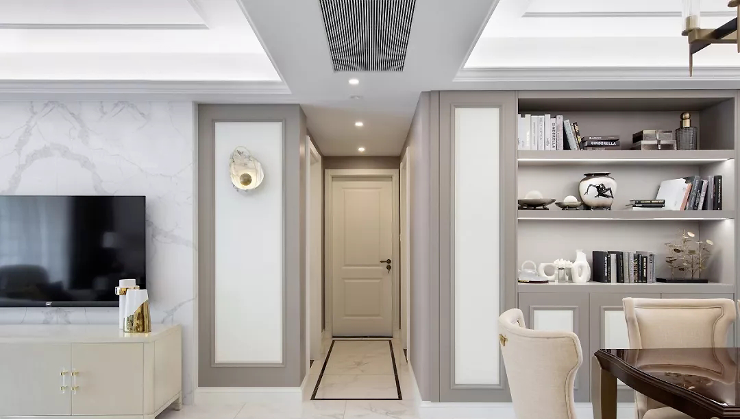全屋定制的木饰面以白色和浅灰色为基调,搭配上配色相仿的家具,以及亮眼的金属墙饰、茶几、灯具和装饰摆件,增加了空间的时尚感,凝聚出美式轻奢小资情调。