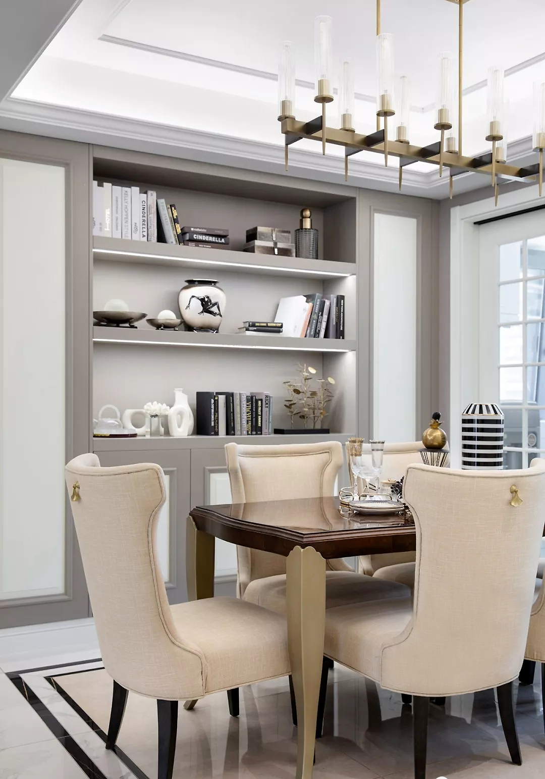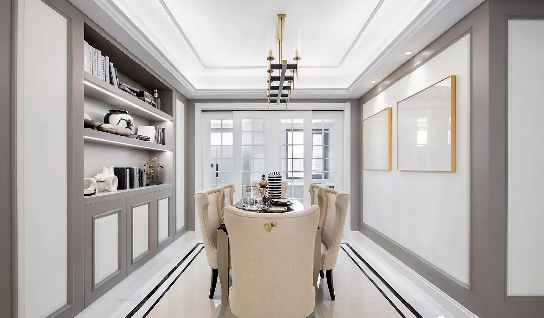 餐厅延续客厅的风格,用浅灰与白色的木饰面,搭配金色边框挂画,倒映着每一餐的温馨时刻。