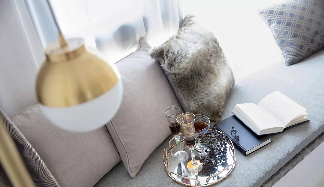 超大的飘窗上摆放舒适的坐垫与柔软的抱枕,在这里看书、品酒和聊天,宁静而又浪漫。