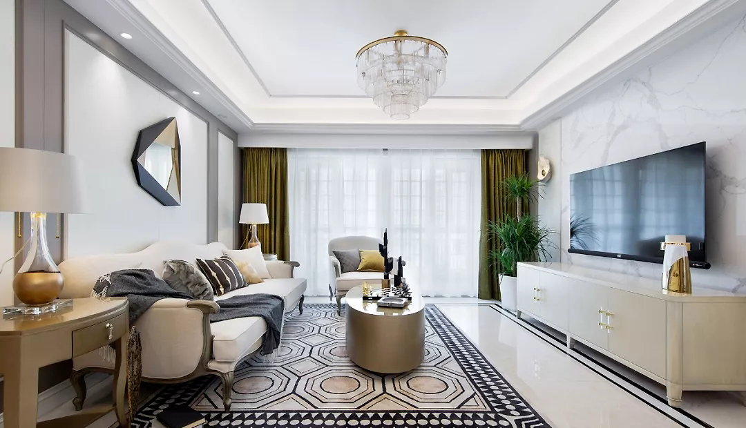 客厅,简约的灰色基调颇具包容感,高颜值复古风地毯,提供了一个优雅考究的界面。米色美式沙发优雅而舒适,黑色与金色元素在整体色彩中的穿插运用,带来充满张力的空间魅力,雅奢氛围蔓延开来。