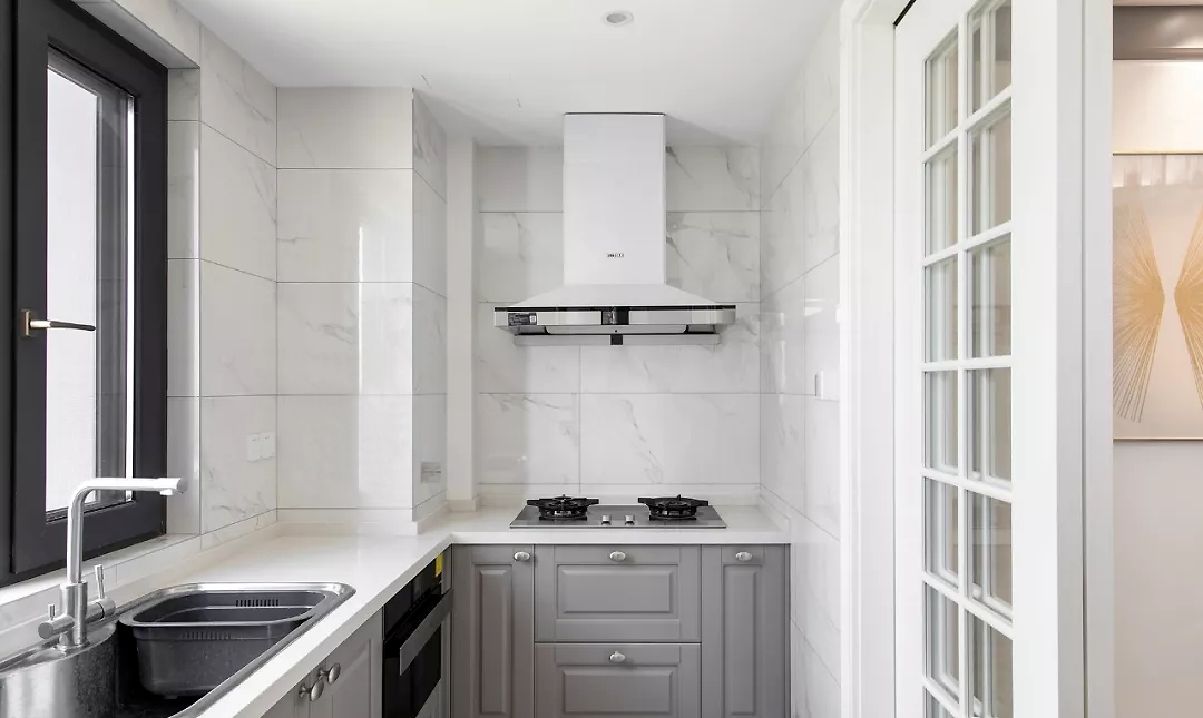 厨房,从地面到墙面的全面白色大理石铺设,加上窗外自然光的映射,带来独有的干净气质。